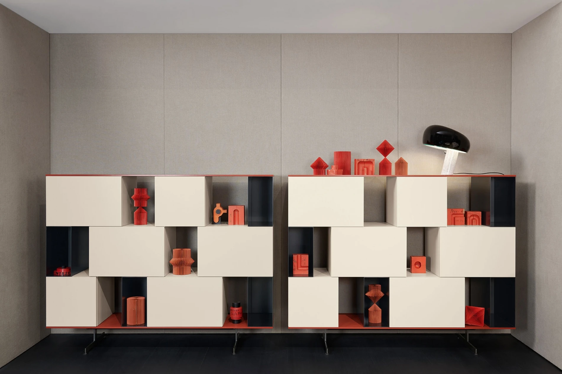 Suspended on a Left foot, the Mondrian twin compositions play with the interchange of full and empty spaces, featuring a series of avorio lacquered containers and metal boxes in iron finish between two rosso antico painted metal tops. A small family of sideboards that are available in 3 different sizes and can be customized in the mix of finishes.