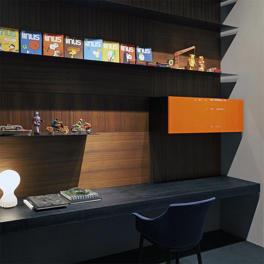 A twist of colour is provided by the Modern hanging units with drop-leaf door or the open cabinets lacquered in arancio zucca.