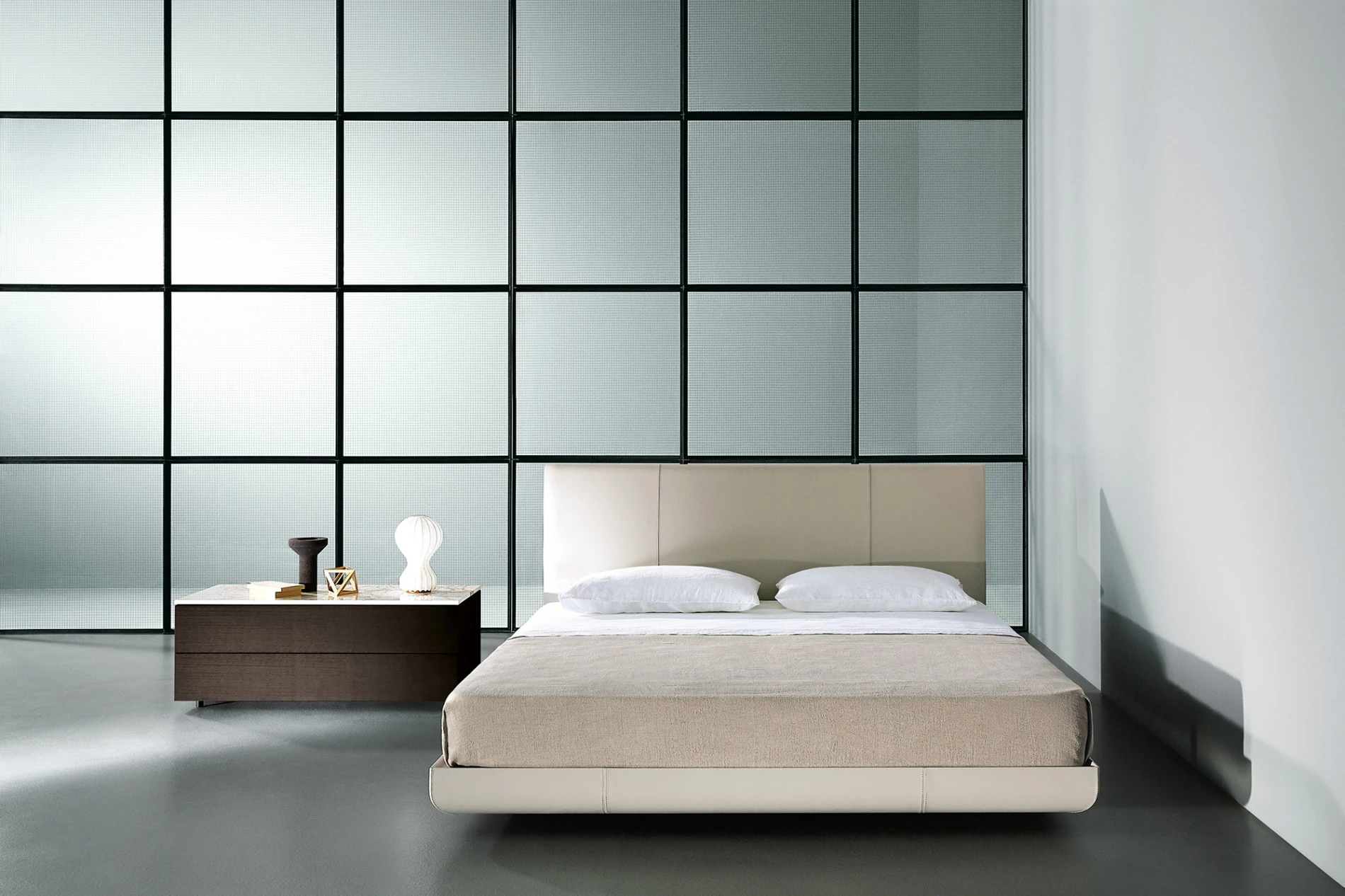 An intimate size and a complete leather cover characterise the Sadoru bed. Tall and solid, easily fits all home and contract environments, where the eye is captivated by the chosen material. The thickness, the double seam and the refined detail of the large, curved headboard, reveal a creative, ingenious project and an almost hand-crafted saddlery-like production.