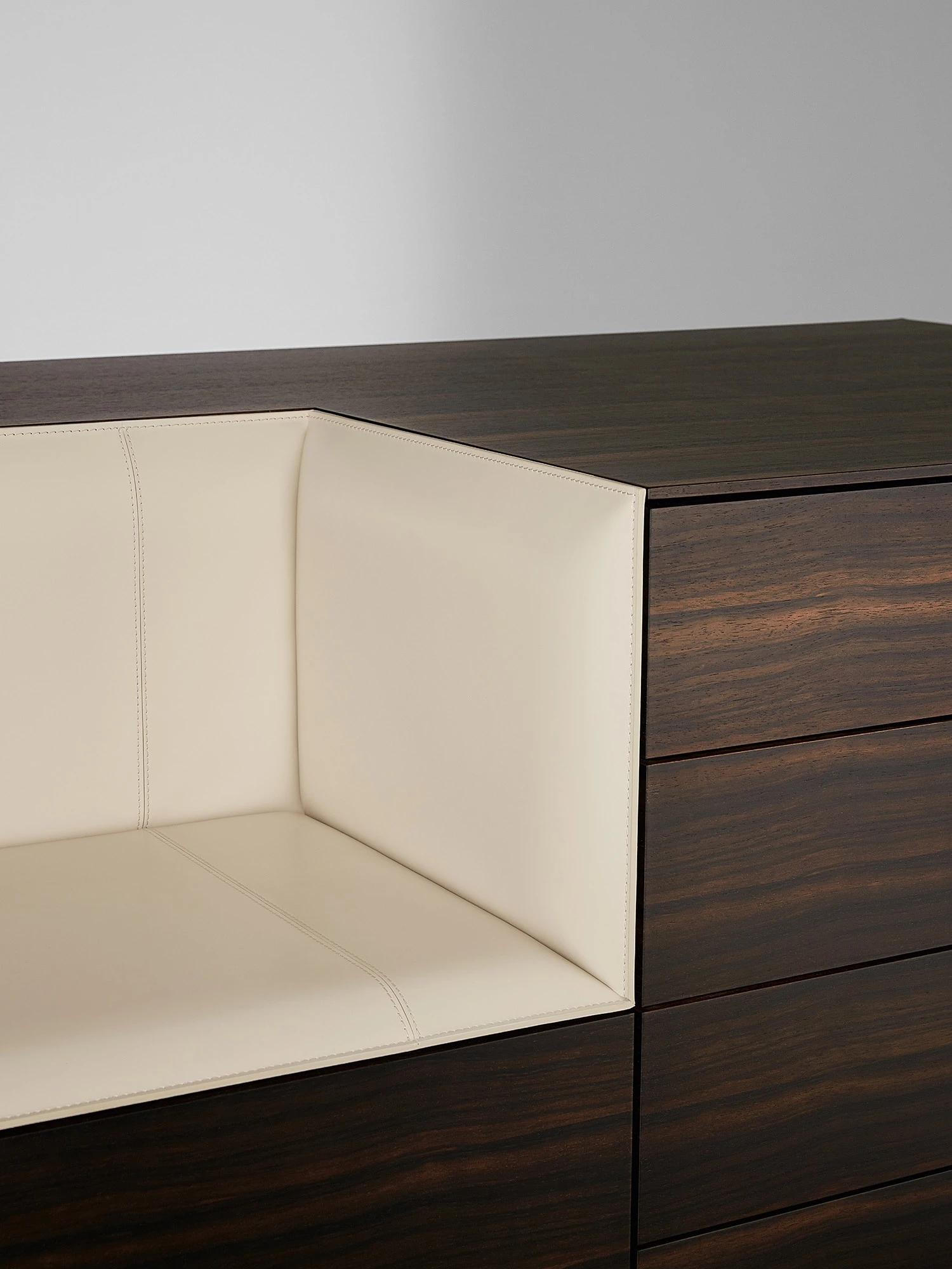 The Hub family encompasses double-face central units, where drawers are combined with open shirt and bag holding modules, leather trays and comfortable leather benches to create ideal storage, displaying and holding solutions for the dressing room. The wide range of finishes allows for a customization of the product, that here alternates glass and pale moon drawers on one side and an corda leather bench solution with a large drawer on the other.