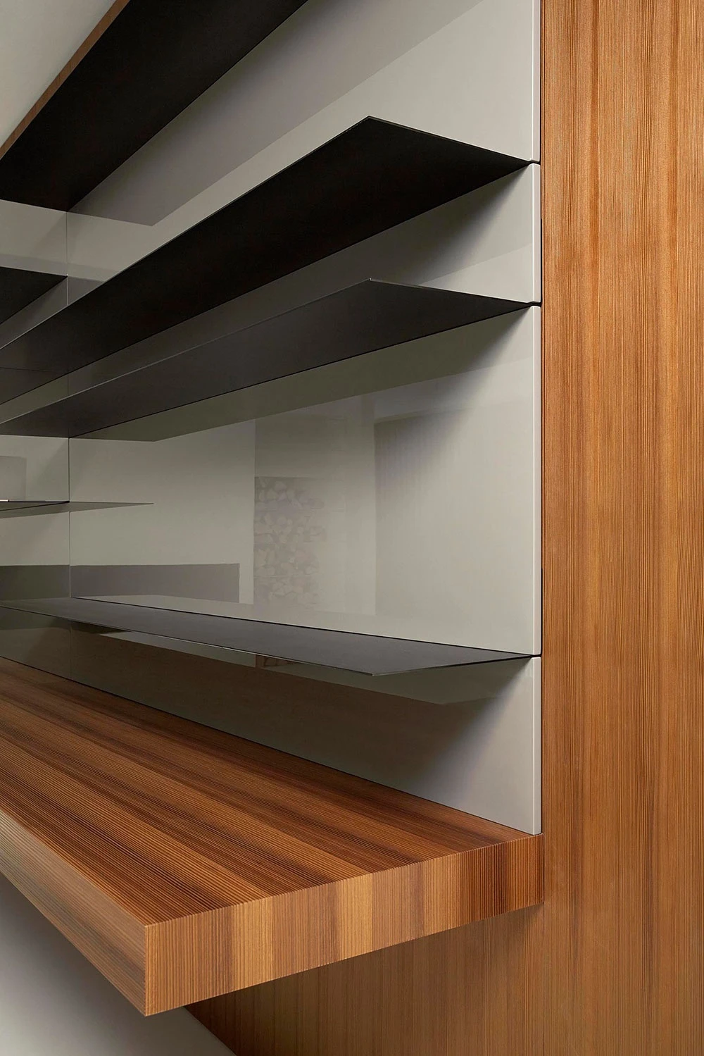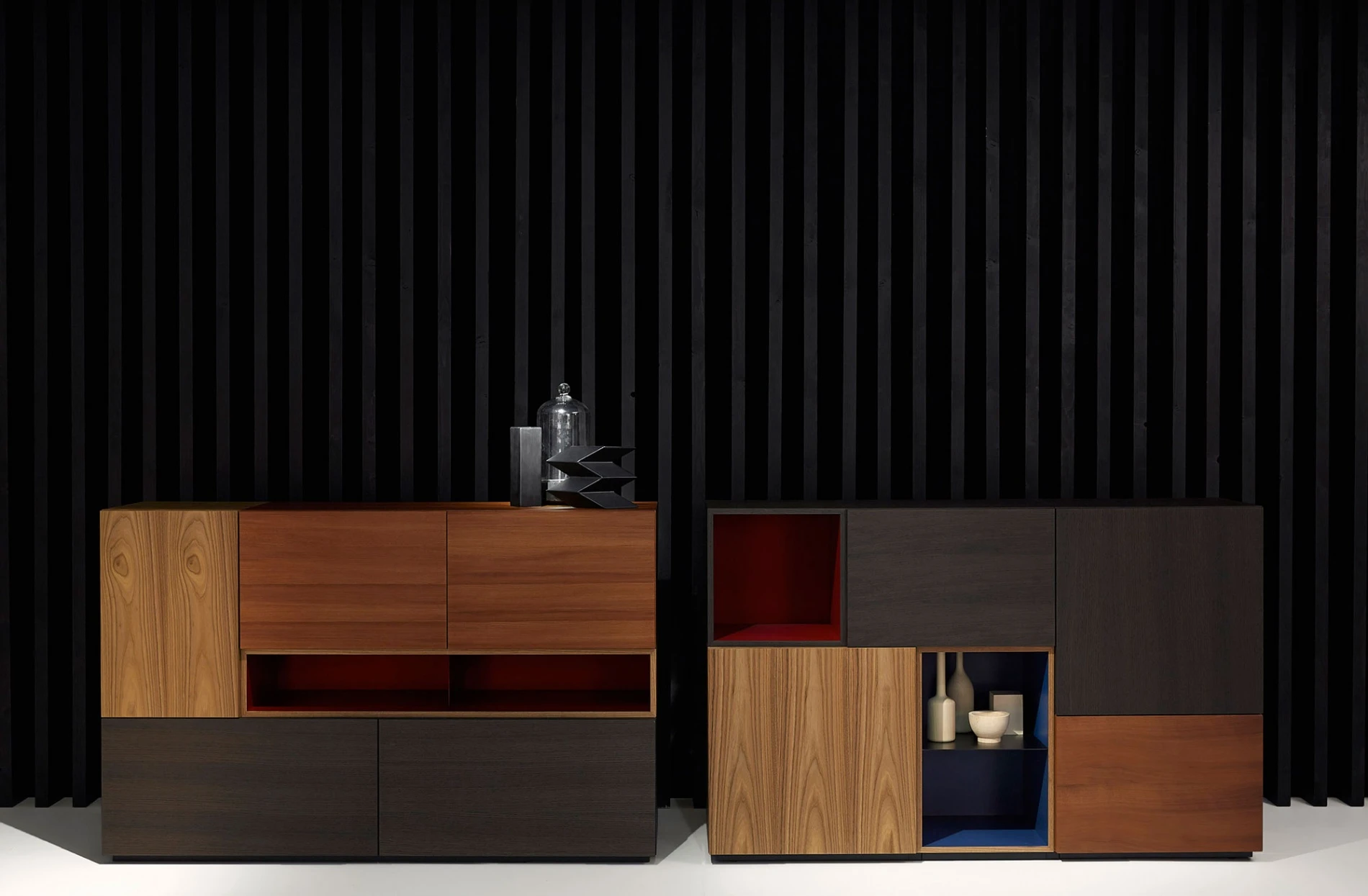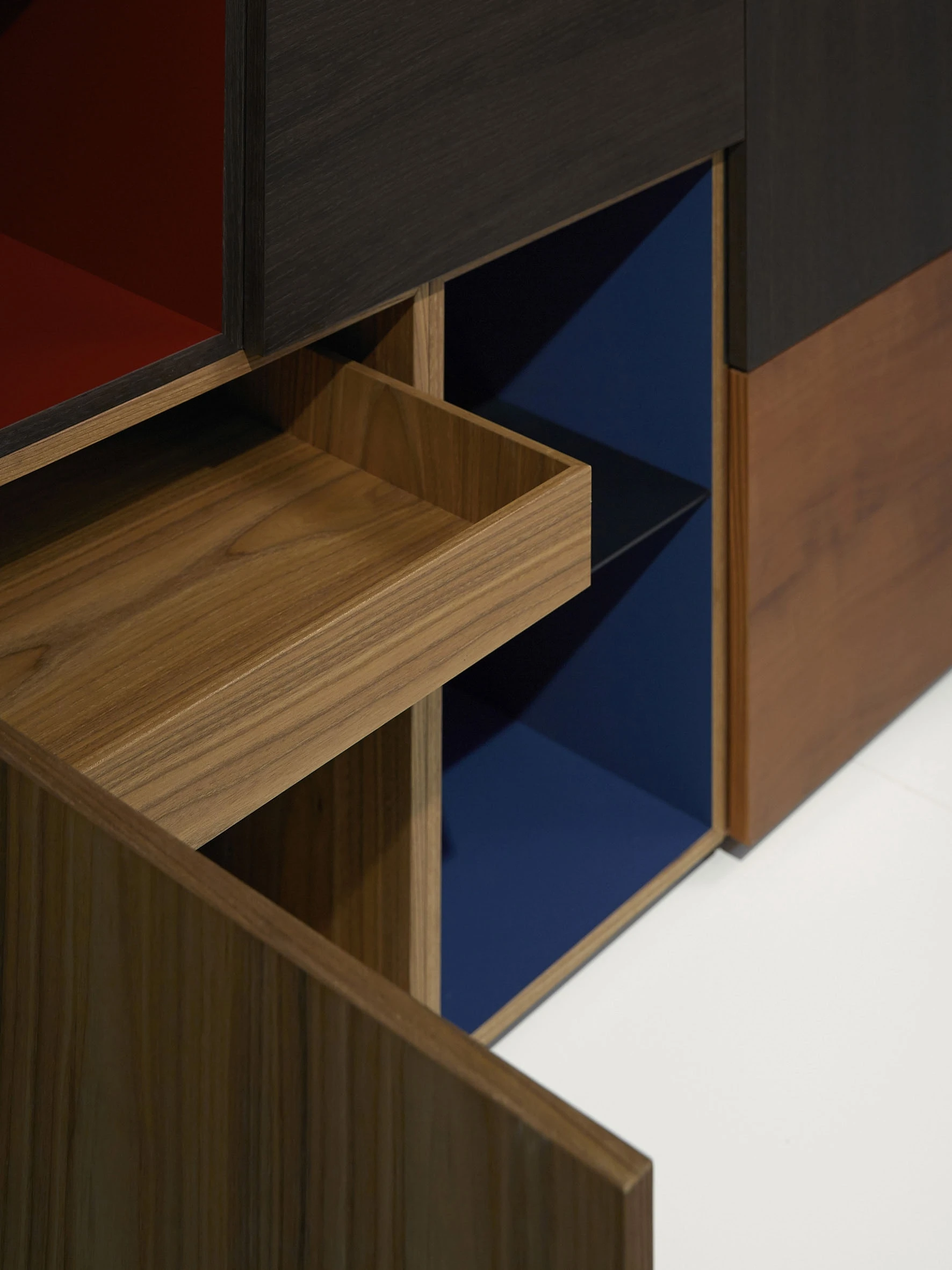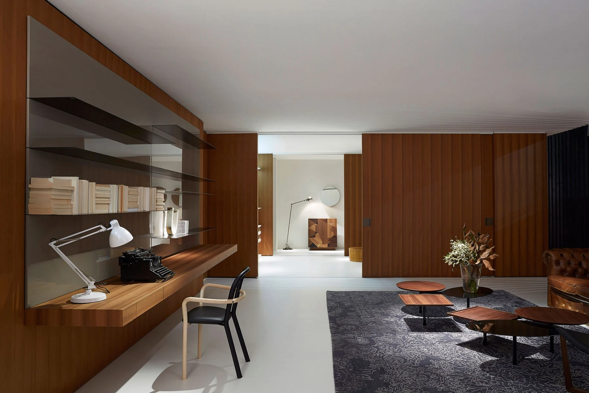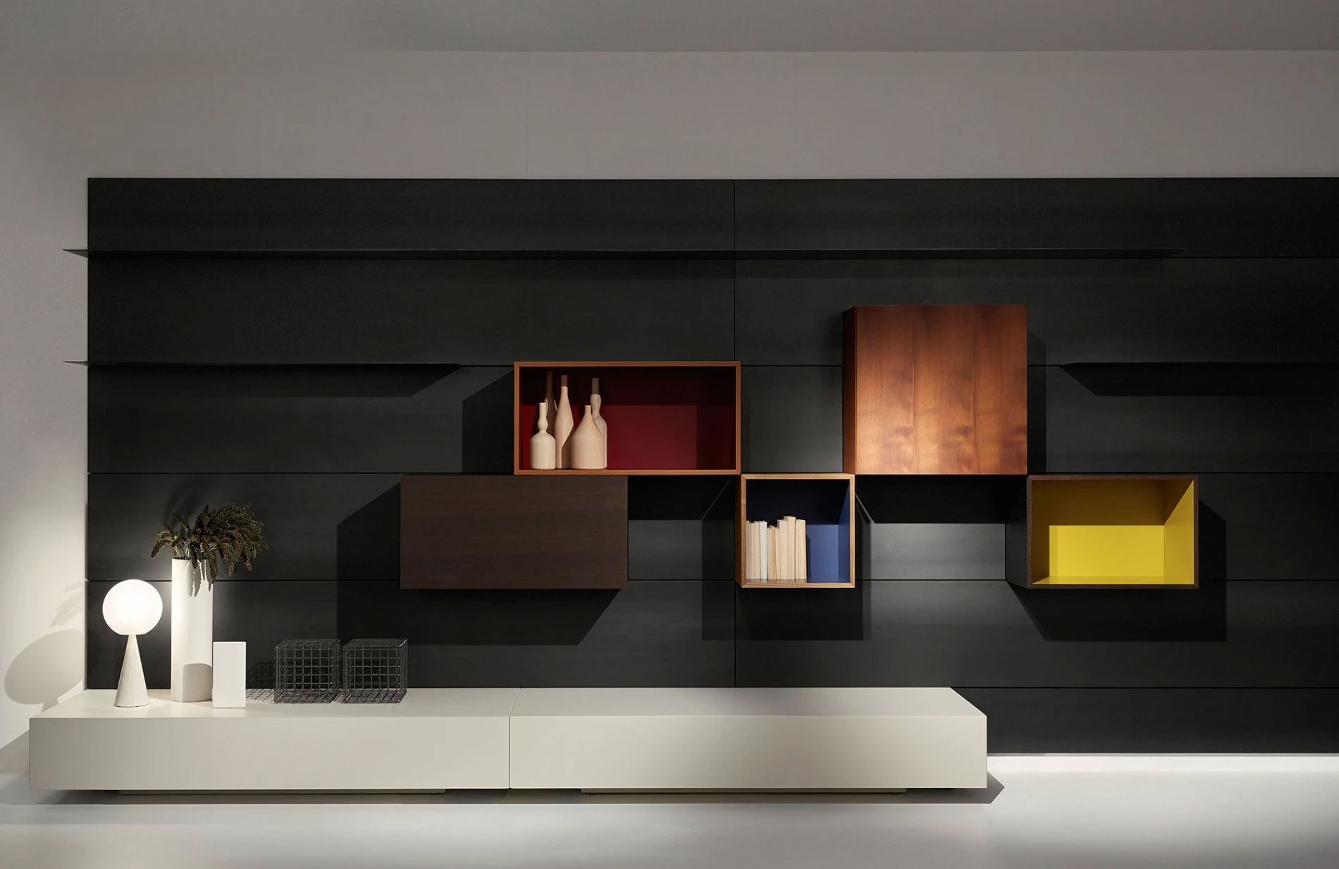 Modern, the system of containers and shelving for living rooms, is proposed for 2014 in compositions mixing colour to the various essences of Porro selection of woods, for a polychrome without fear, with a hint of anarchy, which experiments new combinations and custom-made palettes. New Modern floor cupboards, raised up on a continuous base, play upon the geometric construction of open elements with rosso cina and blu reale lacquered backs and closed volumes in three of the new wooden essences, ranging from the warm and honey-blonde notes of the heat treated elm, to the streaked and reddish brown nuances of the heat treated hemlock, up to the dark burnt sienna hues of the heat treated oak. An eye-catching mix of bookcase, container and display unit, the new Modern + Load-It compositions combine the containing capacity of the Modern system with the graphic impact of the Load-It bookcase. In the living area, the wall panels and the steel shelves of a full-length Load-It bookcase are proposed with the board and the hanging containers of Modern, creating ample equipped surfaces on the wall, with flashes of color alternated to wooden essences, in order to live in color, meanwhile in the study area the wall-mounted panels and shelves of Load-It make way for the Modern suspended shelf: a long, unbroken writing desk, fixed to the wall, creating a quiet, peaceful space for a home office.