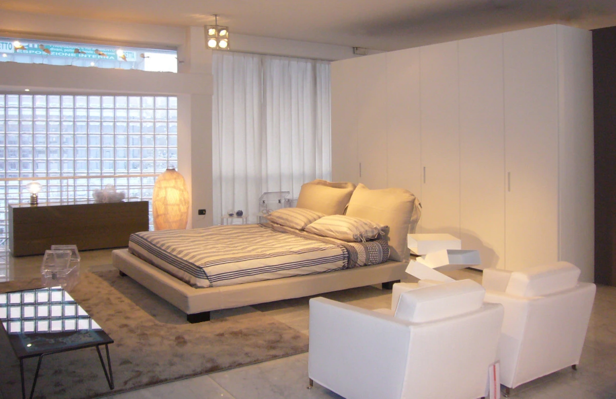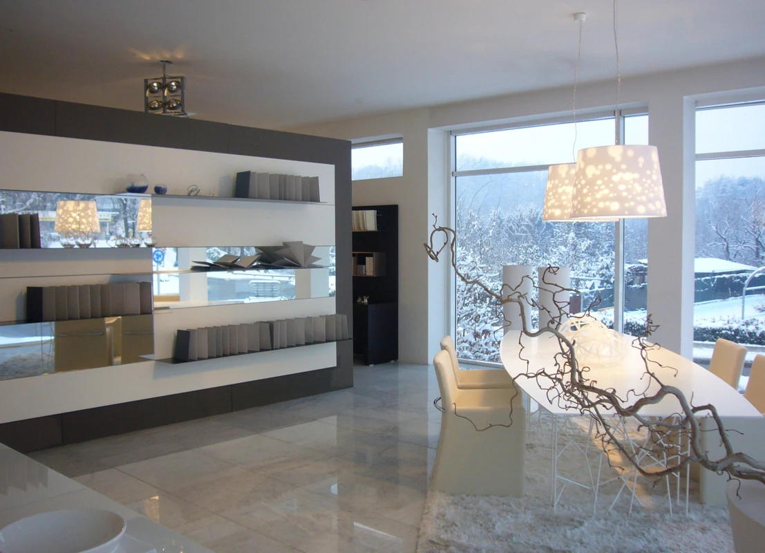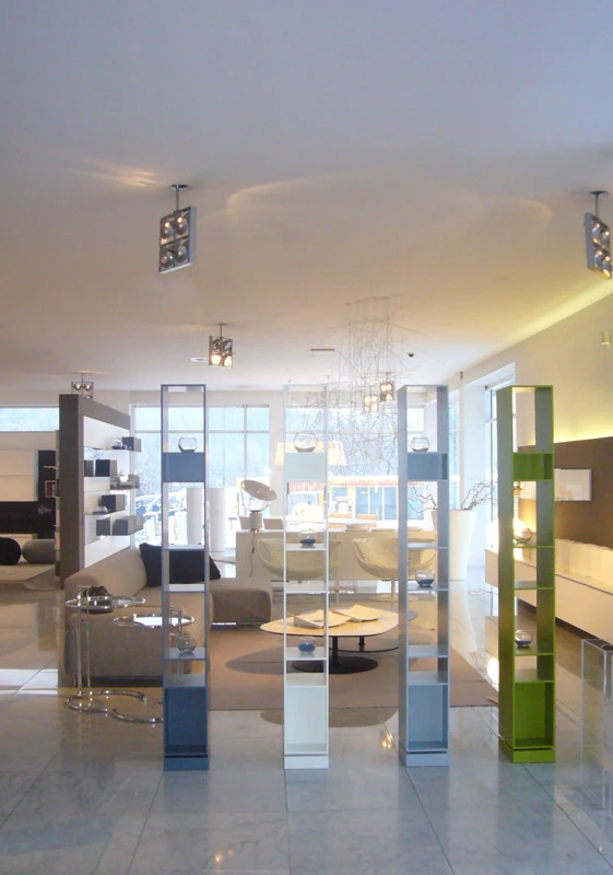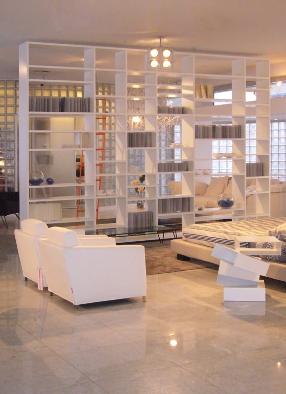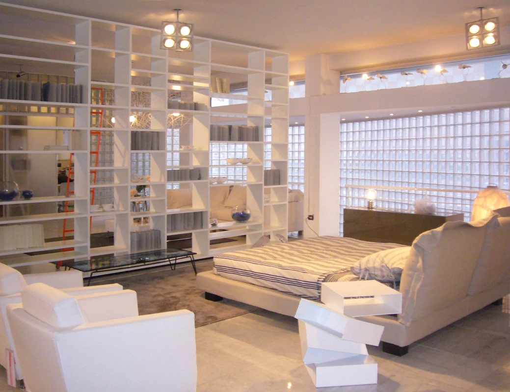 A selection among the most successful products of Porro catalogue, which enters in perfect harmony inside the contemporary architecture which contains it, white wide spaces in which the light penetrates through glass blocks walls.