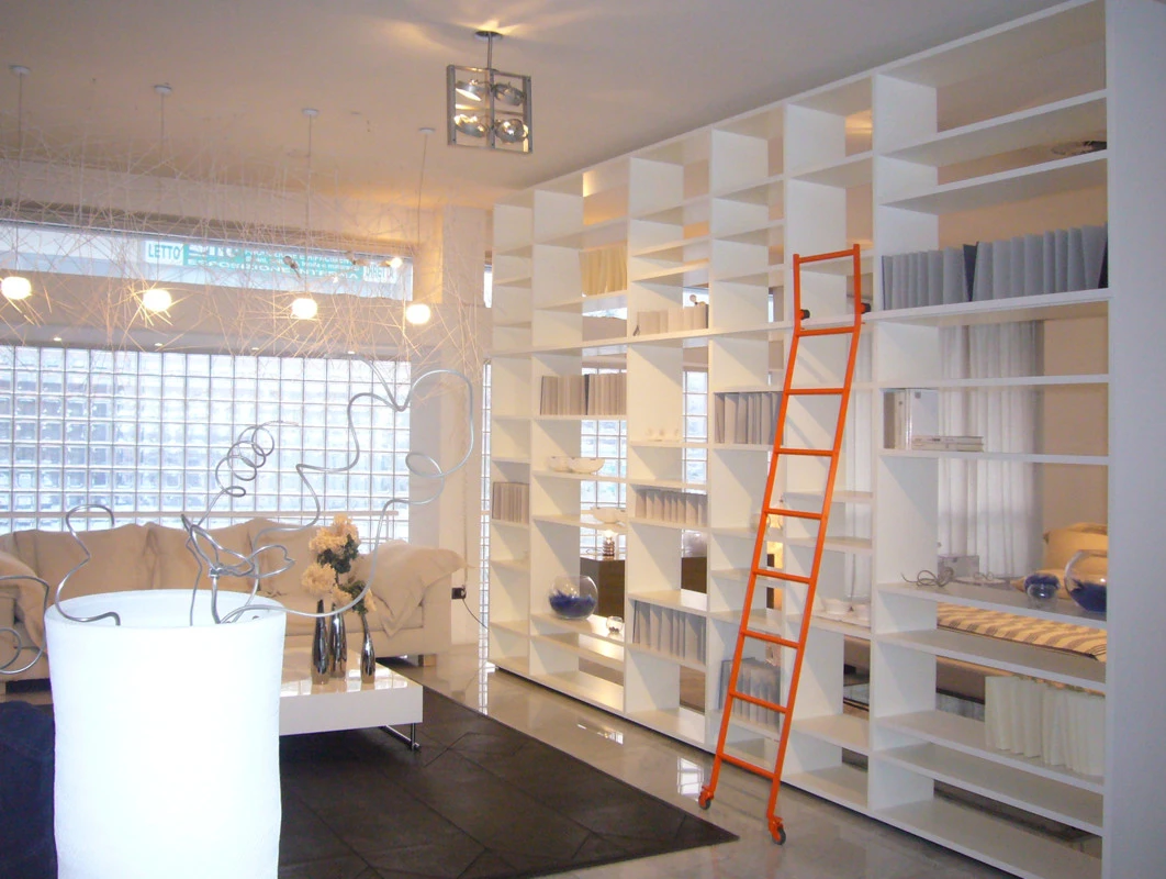System , the modular bookcase characterised by typical open shelves that make it a piece of furniture indispensable for the home and the working environment, separates the bedroom from the living area. It’s exposed with white lacquered structure with staggered shelves and mars orange sliding ladder, while the scene is completed by Sidewall bookcase on swivel base, in spring green, mud, safari grey and white colors.