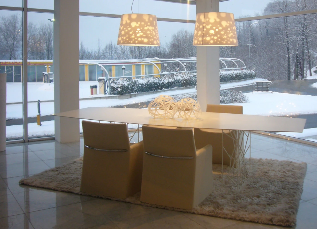 In the dining room, Synapsis table, a spider’s web of white lacquered welded steel rods that delicately supports an ultra-thin matt white lacquered top, is combined with Soft Chair armchairs in white fabric, and Shadow Light suspended lamp, which projects throughout the room a fun and charming dotted motif.