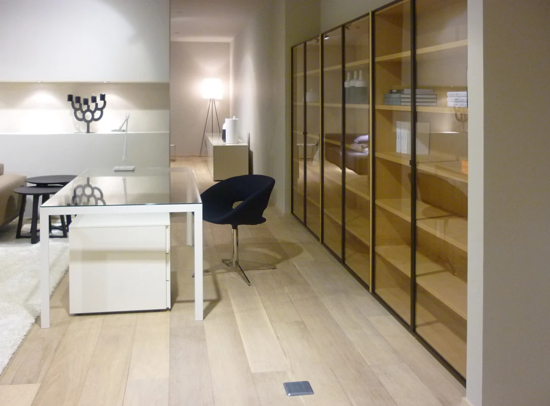 The setting is completed by 3 different compositions of the multifunctional and eclectic System, which can be used as a bookcase, a module for electronic media, an office area, or even as an element to divide rooms and create equipped walls. The first one is a multifunctional composition in black stained hemlock, composed by open shelvings and elements closed by sabbia coloured doors. A section on the right is reserved to TV and HI-FI components, equipped with a storage unit for CDs and DVDs, ideal for contemporary living rooms. The second one is a wall composition creating a working area fitted out with open shelvings for books, back panels and a desk-top in hemlock, and structure, doors and drawers in avorio finishing. Finally the last one is a bookcase characterized by a vertical design with overlapping shelves, which renew its image, focussing on an attractive and dynamic asymmetry.