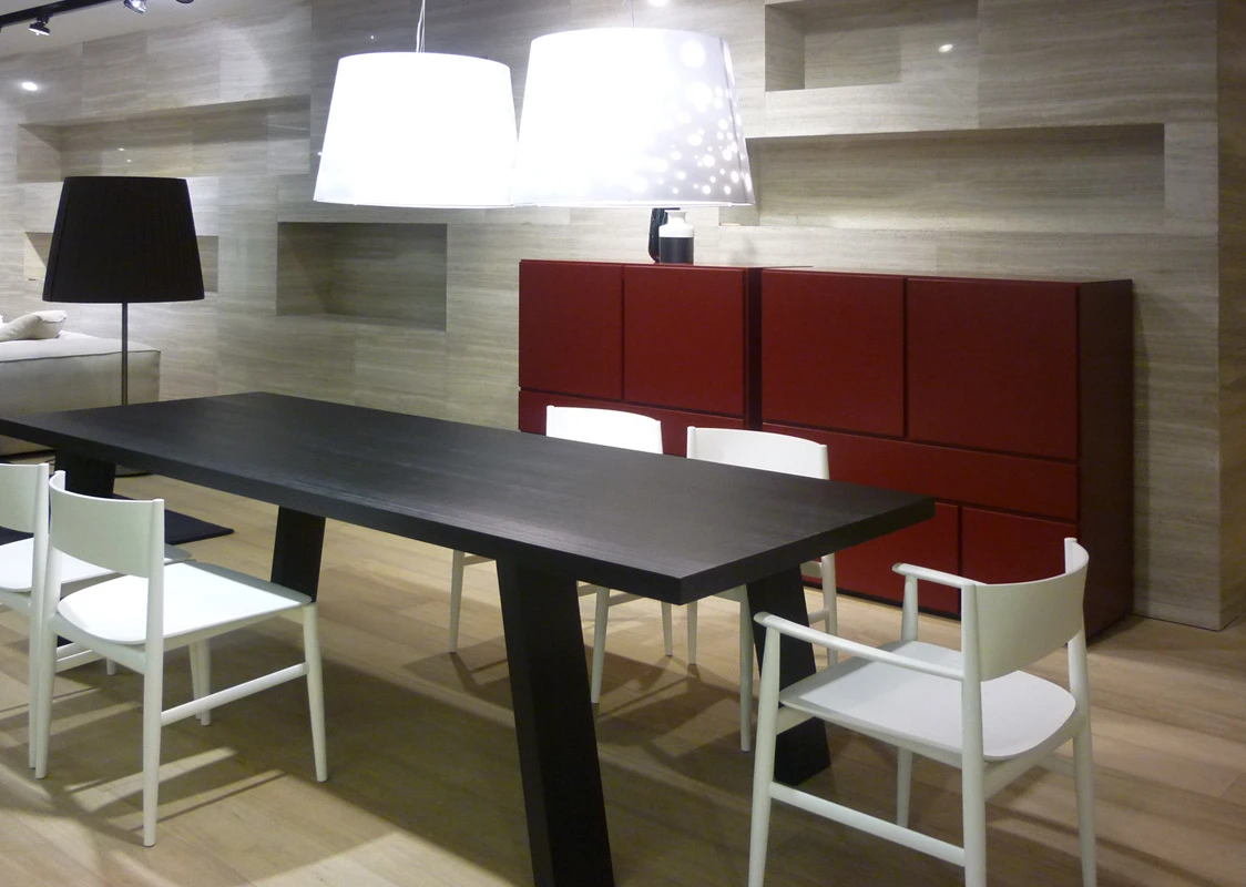The materiality of wood is instead protagonist in the dining room which proposes Minimo table in black stained hemlock, Neve chairs in white stained ash, Shadow Light suspension lamp and Modern red cupboard with “small” doors.