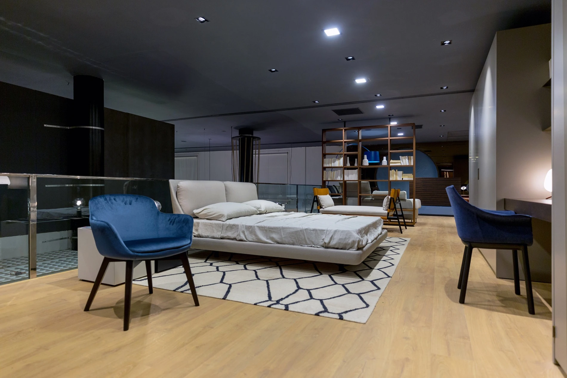 Protagonist of the bedroom with its slightly suspended form the Makura bed by Piero Lissoni in light fabric, combined with a Hinged Storage composition with lacquered 32S doors interrupted by a vanity niche created with the Load-it bookcase and Modern writing desk. For relaxation, the Jade lounge chair by Christophe Pillet is displayed suspended on the wooden base, juxtaposed to the Traveller daybed by Gamfratesi in leather.
