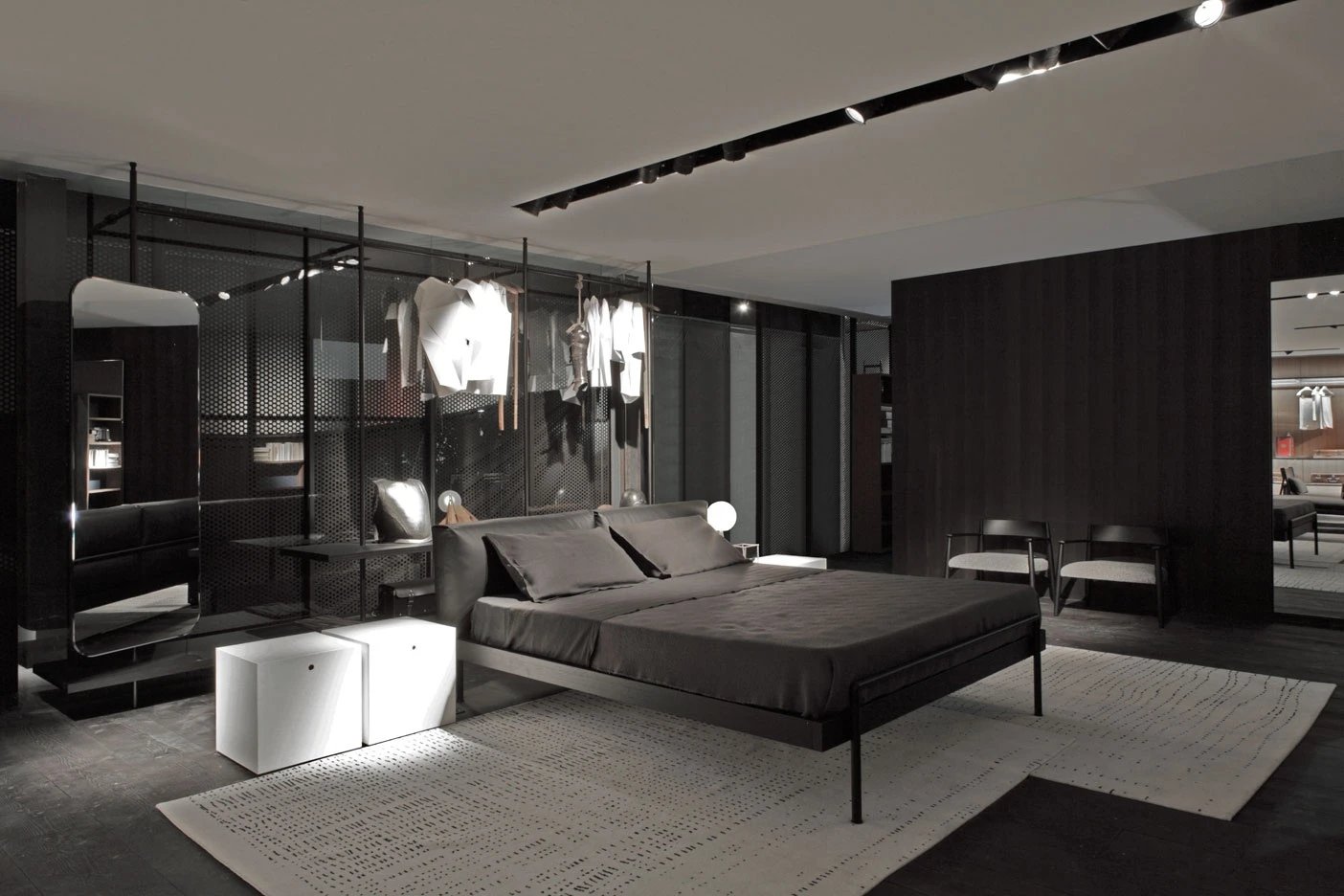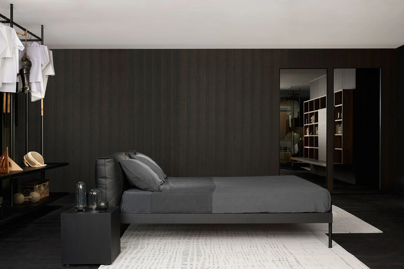 In the first bedroom the masculine elegance of Shin bed in total black with a black stained ash structure, black painted footboard and headboard cushions in black leather is matched with a black stained hemlock Offshore bedside table as well as the new Mast walk-in closet. On its light matt black tubular metal frame, black stained hemlock protruding shelves are fitted as well as a wide rectangular mirror with blunt corners, a consistently impactful solution with a minimal, pure and original approach, for people loving caring for themselves. On the wall behind the bed, the Reflection mirror with a bronze satined, painted metal frame.