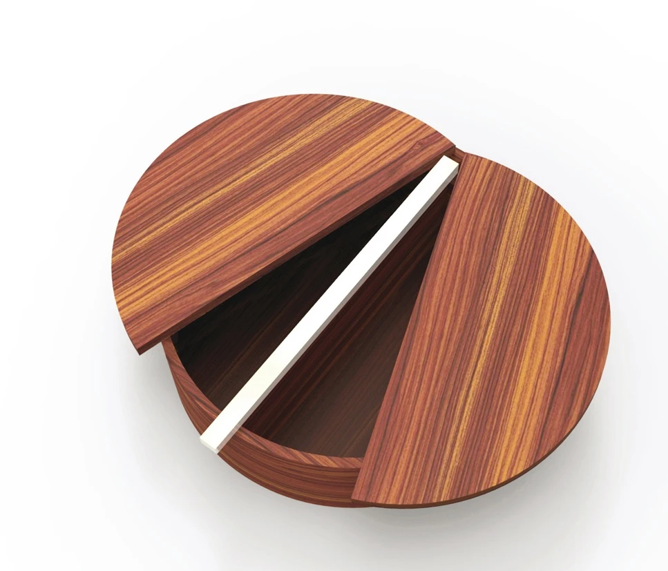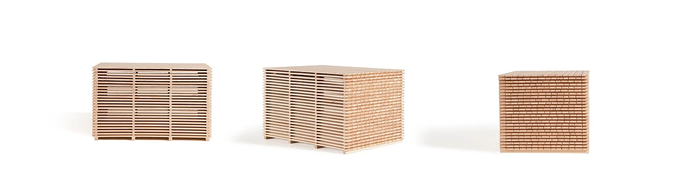 If Piergiorgio Cazzaniga’s wooden box is ispired by the “meda”, the woodstack once made in the villages to dry the wooden boards creating real wooden towers, that looks like a Japanese architecture, Gamfratesi’s wooden box is an homage to Porro’s logo designed in 1966 by Bruno Munari with its O shape that opens up like a ladybug, while the Lucidipevere’s is a wooden box made from one single veneer sheet, curved and closed through a brass jo int that functions as an opening system.