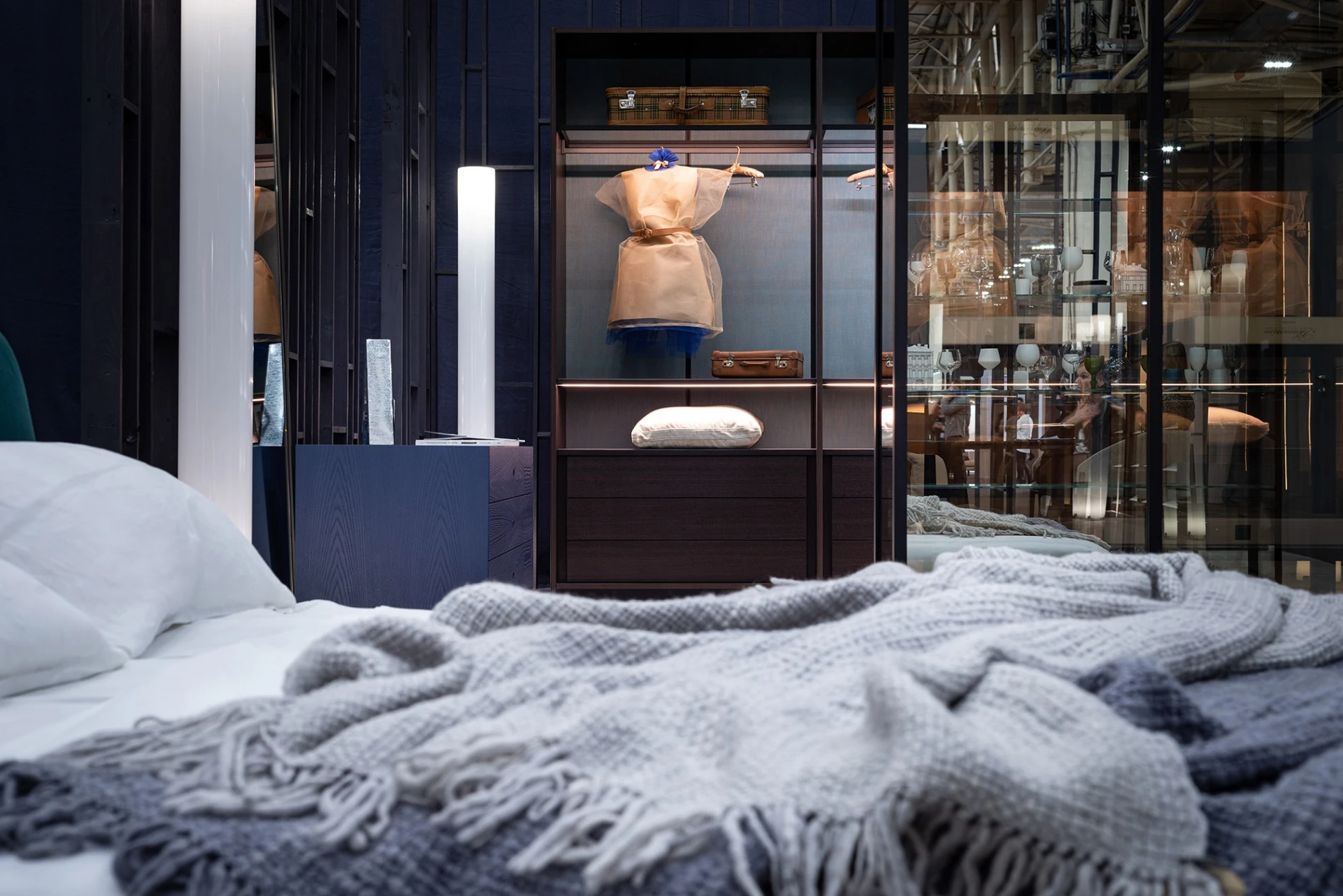 A twist of colour is provided by the Offshore containers designed by Piero Lissoni, presented with exteriors in royal blue open-pore stained ash wood and interiors in natural maple, in the 3-drawer version designed for the needs of the sleeping area. Relaxation is served by daybed Traveller by GamFratesi, with side backrests where a “saddle effect” saddle leather is stretched on, to contemplate our own collection of clothes.