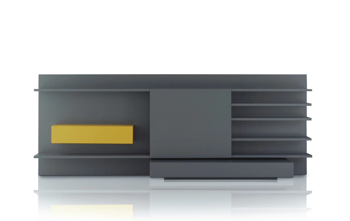 A baseboard with drop leaf door to store media equipments is leaned to a backpanel enlivened by shelves and surfaces : a grey total look with the new sliding door running along the whole composition. Suspended unit in the new height H. 300 mm, that communicates Energy with its yellow colour. Shelves are available in two thicknesses.
