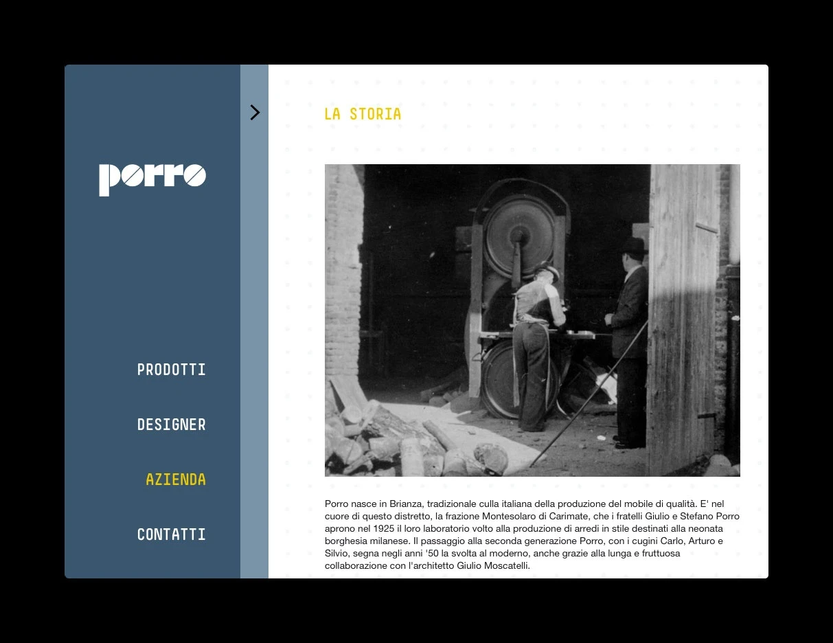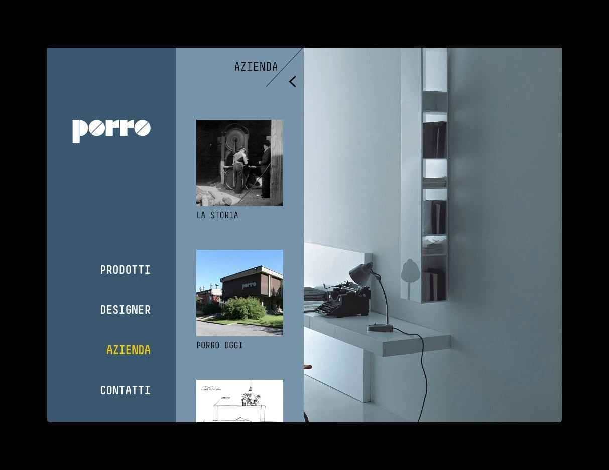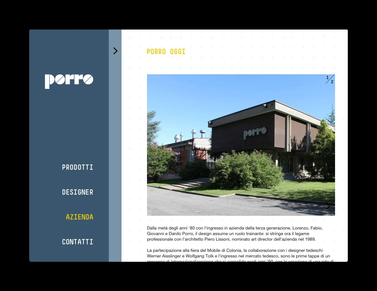 The history, Porro today, its philosophy, its production, markets, points of sales and contracts are subchapters of the company section: an introduction to the brand, which will allow to better discover the steps of Porro development in time, its strong decisions taken process, the company industrial site, the network all over the world and the offered services to designers, that is the main factors supporting the company growth from the heart of the Brianza area to the entire world, from residential to turnkey projects. And then the photo gallery with the main company references (from the Italcementi center in Bergamo to the Richemont Holding offices in Geneva, from the showroom Sarto at La Valletta to the Restaurants Maxxi2i in Rome and Lacucina in Mantua, up to the hotels Les Fountains in Chantilly and Sezz Saint Tropez), to prove the Porro capacity to manage complex project with finally top quality achievements.