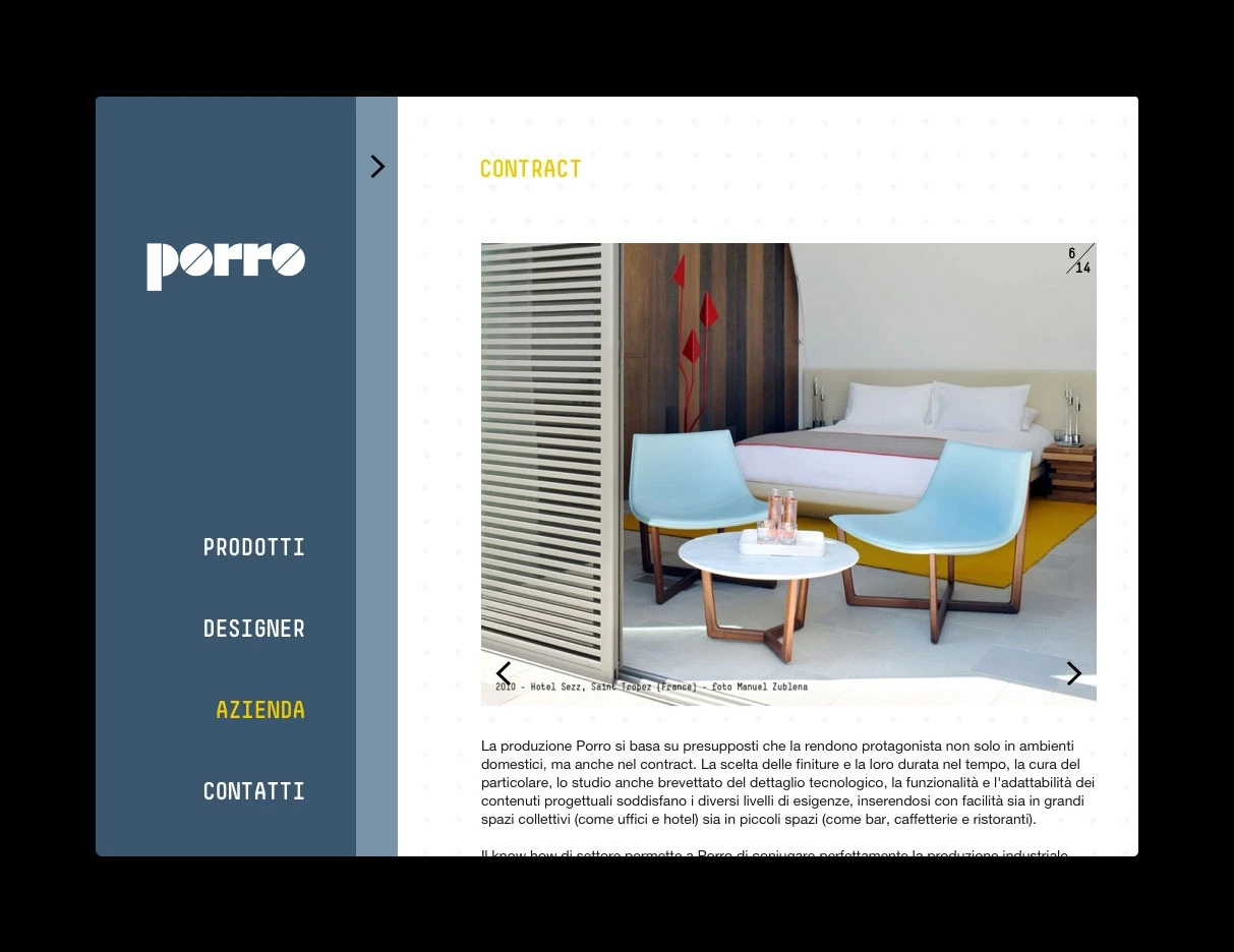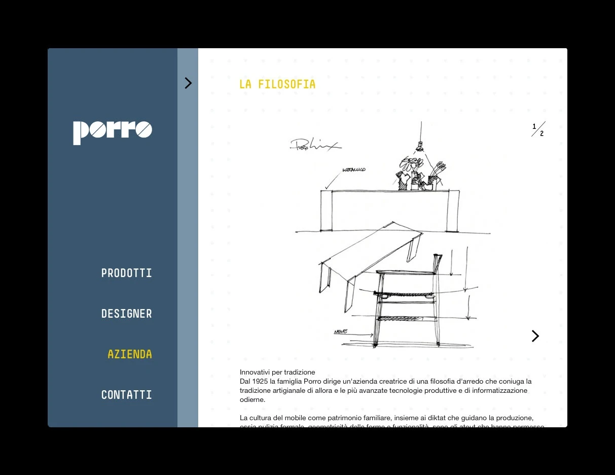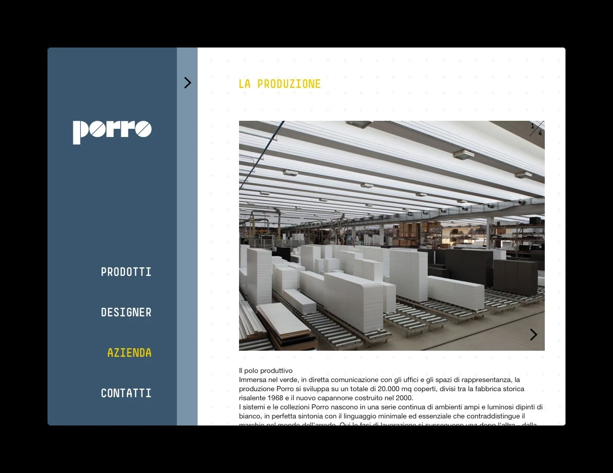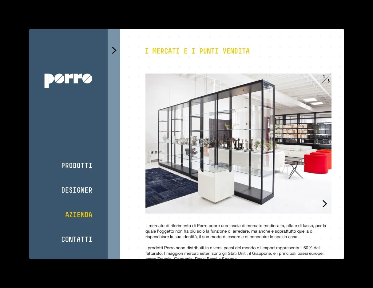 The history, Porro today, its philosophy, its production, markets, points of sales and contracts are subchapters of the company section: an introduction to the brand, which will allow to better discover the steps of Porro development in time, its strong decisions taken process, the company industrial site, the network all over the world and the offered services to designers, that is the main factors supporting the company growth from the heart of the Brianza area to the entire world, from residential to turnkey projects. And then the photo gallery with the main company references (from the Italcementi center in Bergamo to the Richemont Holding offices in Geneva, from the showroom Sarto at La Valletta to the Restaurants Maxxi2i in Rome and Lacucina in Mantua, up to the hotels Les Fountains in Chantilly and Sezz Saint Tropez), to prove the Porro capacity to manage complex project with finally top quality achievements.