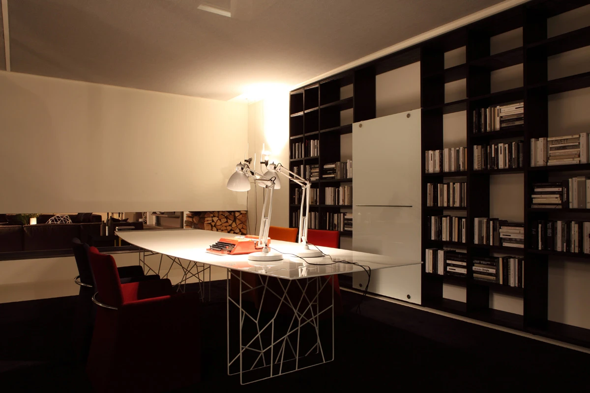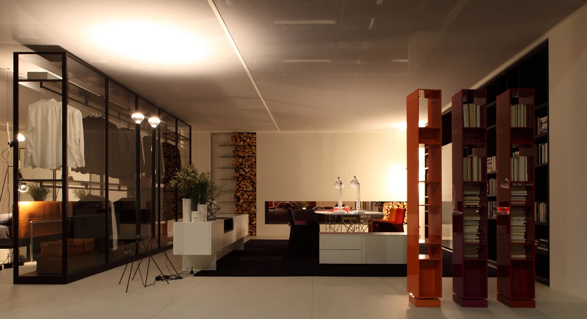 Porro took the decision to introduce its “house idea” to the German and Northern Europe public, rediscovering the pleasure to live according to the Italian style: a living room, a dining room, a bedroom and an office all around a central mark, recalling a big fireplace.