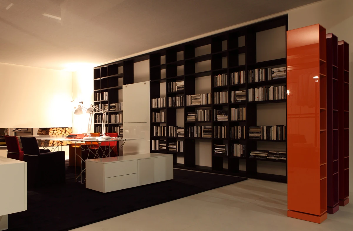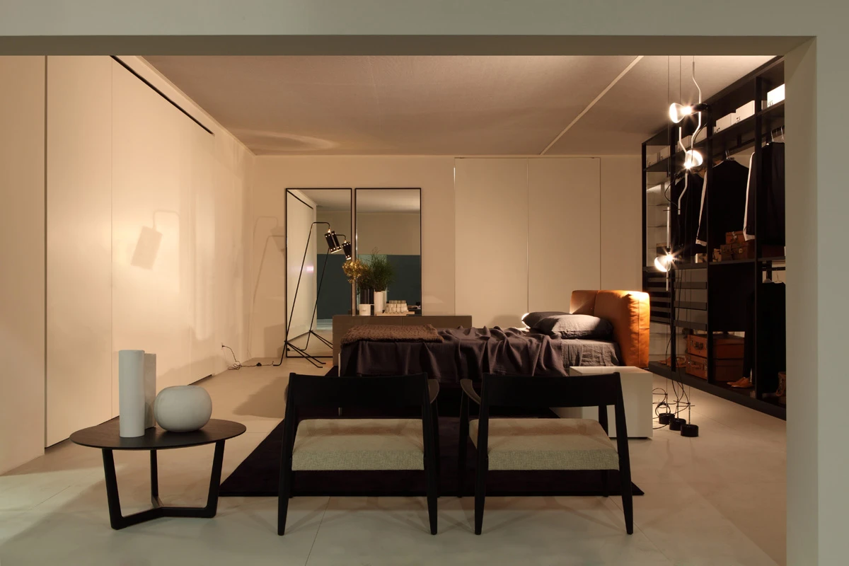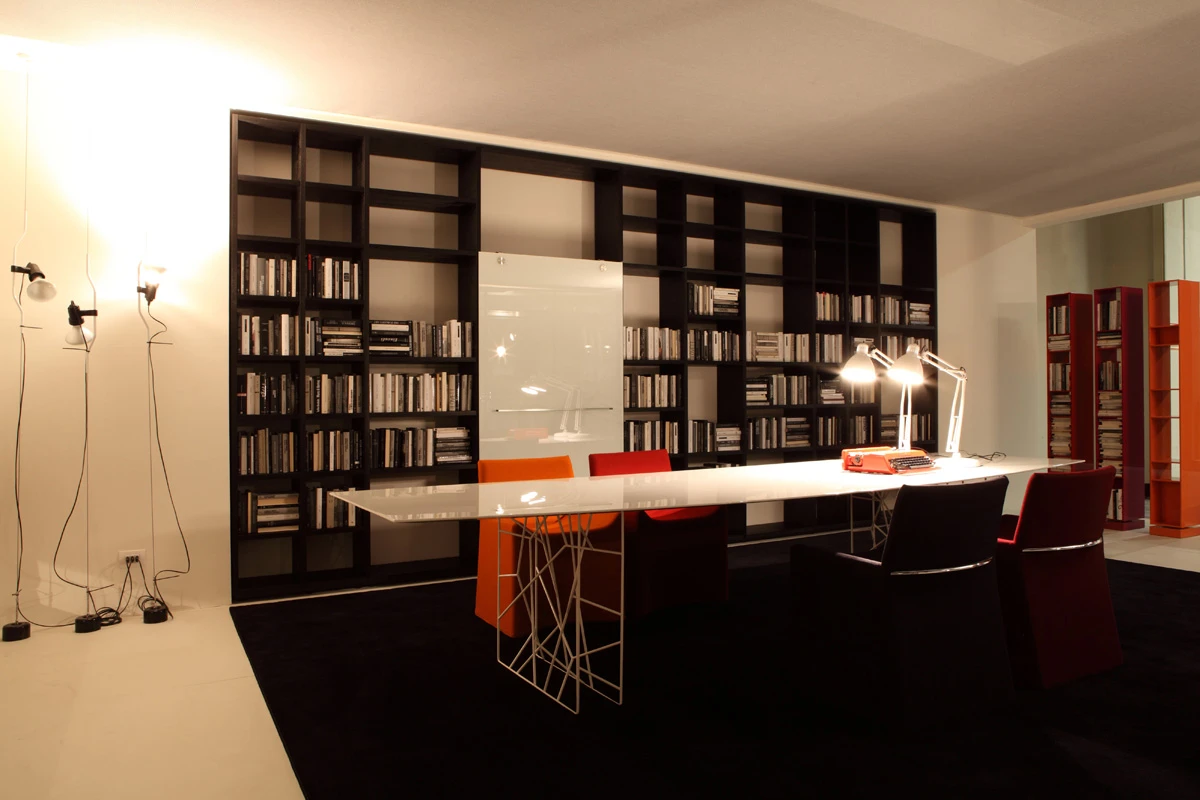 In the first ambiance, the office, the twisted lines of the Synapsis table stand out with an oval white lacquered top and a white lacquered steel base, matched with the embracing and comfortable shapes of the small chair Soft Chair covered in orange, bordeaux and violet-blue fabrics. Strong colours stand out from the bookcase unit, based on a pivoting base unit, Sidewall in rosso fire, arancio fiamma and amaranto while the elegance of black and white characterise the Modern cupboard on a “lama” foot, in a perfect matching of open units in black stained hemlock and matt white lacquered units.