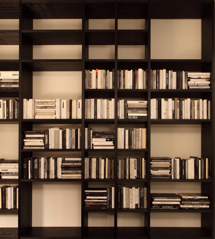 On the wall System, the unit system featuring the typical open shelves making it a required furnishing unit within the house and the office: it exhibits a black stained hemlock structure and a sliding white glass door. The peculiarity is the new 33 cm unit, which matched with the 66 cm unit creates a pleasant squared wall.