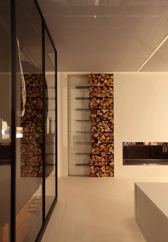 If the outside shell with horizontal and vertical openings is designed by Piero Lissoni clearly recalling architecture, the internal space, about 200 square meters leads to a domestic ambience: refined winter atmospheres where black, ivory, beige and grey stand out, cared for by Porro into details, up to the selection of lamps, modern objects and carpets, transferring the concept of discrete and bourgeois elegance, a metropolitan ambience where natural references are not missing, warming the entire room.