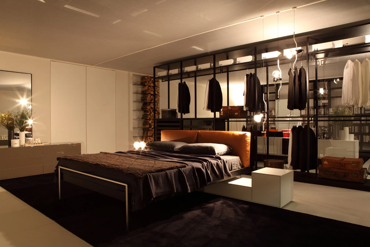The office is separated from the bedroom by the self-standing walk-in closet Storage Air whose upright is a continuous closed profile not to be fitted to the wall. It exhibits glass side and back panels and it is internally fitted with a glass drawer set and wood trays for shirts.