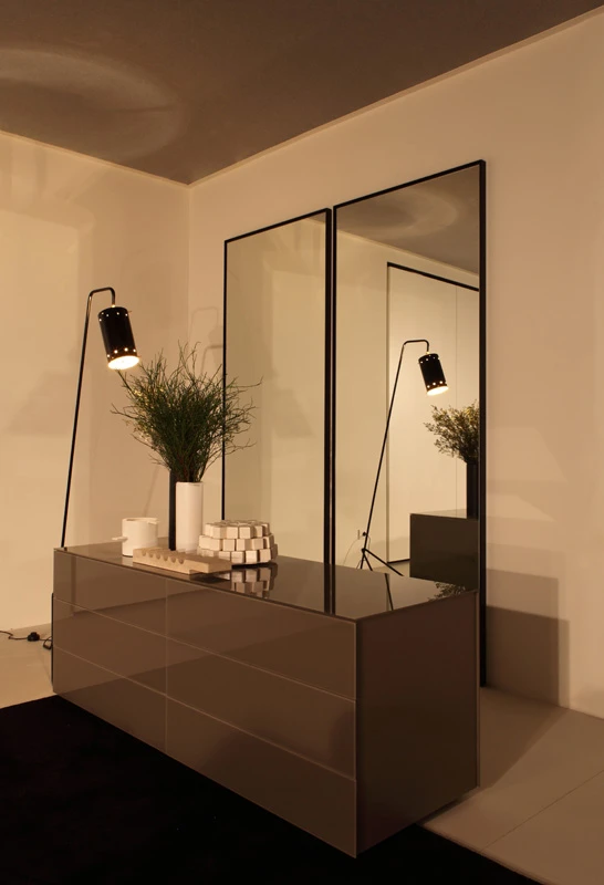 The bed Shin recalls past memories, with its structure in thin wood, where on the front and on the back metal tubular structures are fitted to make the head and foot-board. Accurate finishes as the black stained ash for the structure, perfect proportions and soft wide leather-coloured cushions, to make dreams come true. The bedroom is finally fitted with Truck, bedside tables, consisting of two parallelepipeds on a different height thus leading to the amusing pattern of two scaled drawers, the small armchair Ghiaccio with a black stained ash structure and the seat in rope fabric, the chest of drawers Boxes with 6 drawers in tortora stained glass and the mirror Reflection.