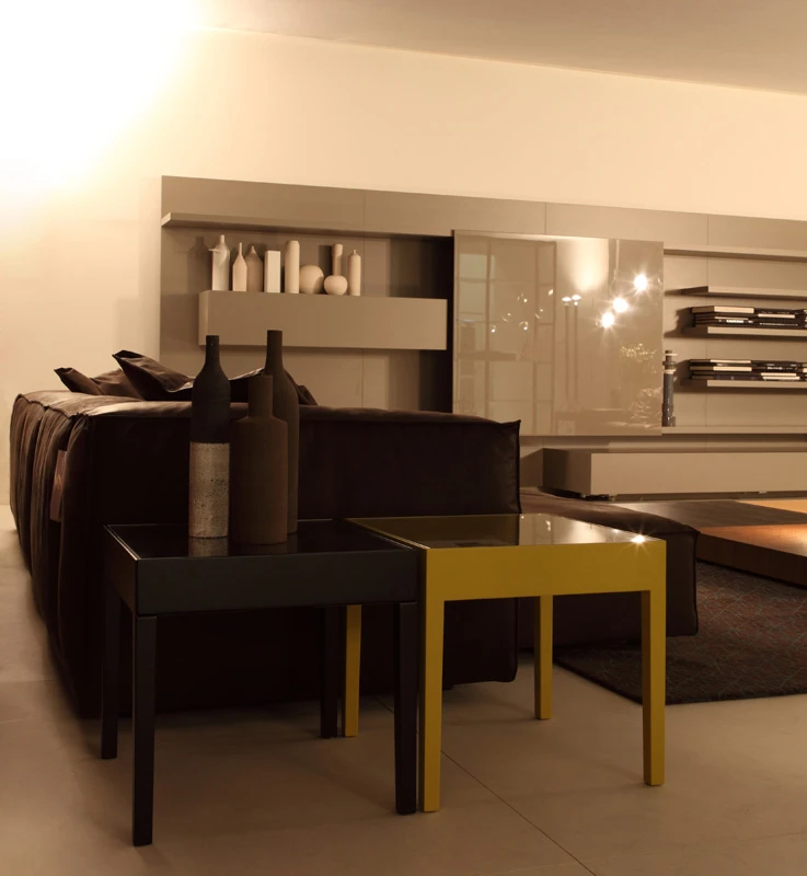 On the back, next to the fireplace, the small tables Showcase Table in the square model in nero and giallo mustard: featuring thin lines. They exhibit a double glass where to store under-glass any daily life object, a book, a pair of spectacles, exhibited as in a glass case, as unique masterpieces.