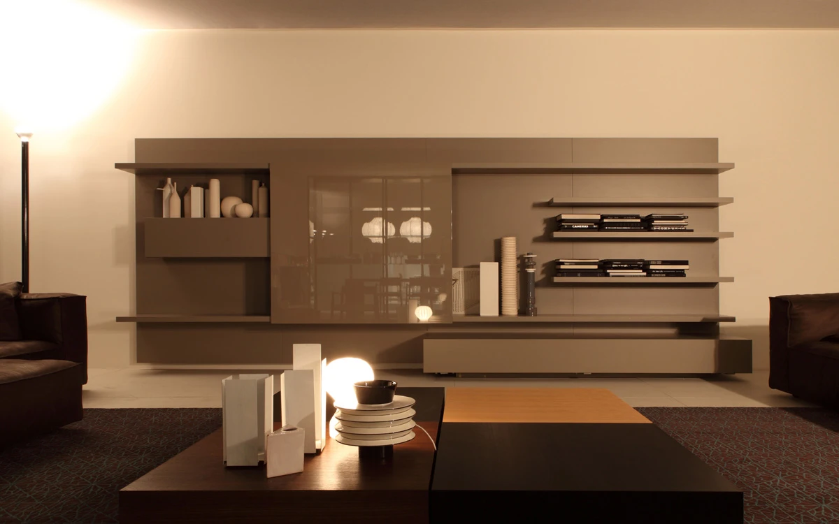On the wall, finally, Modern in a new composition with a wall back panel where to fit any unit. An alluring sabbia matt coloured continuous surface up to the floor, to create a single colour picture to be interpreted as a paper, where to enjoy testing any preferred volume arrangements, closed with a sand coloured bright sliding door.