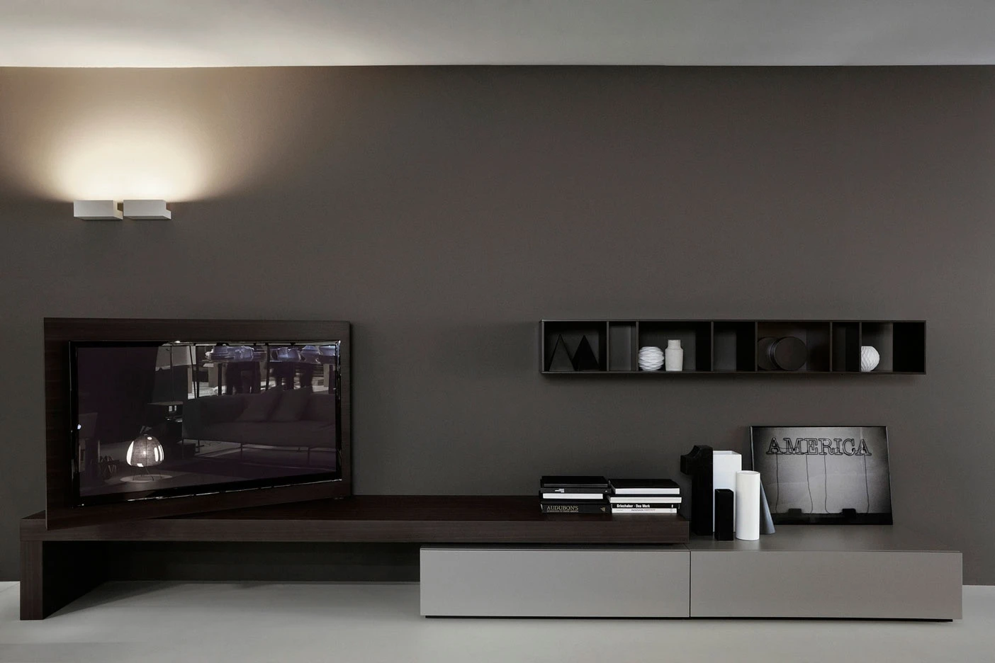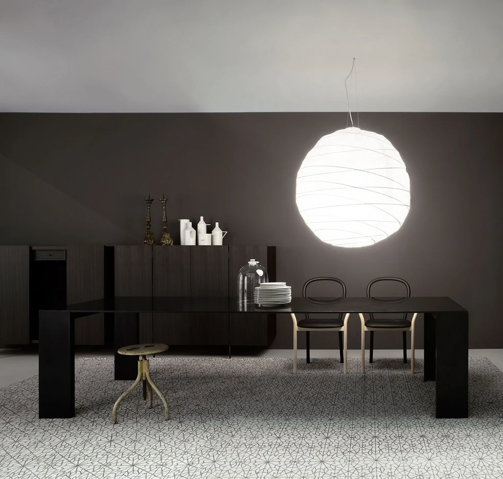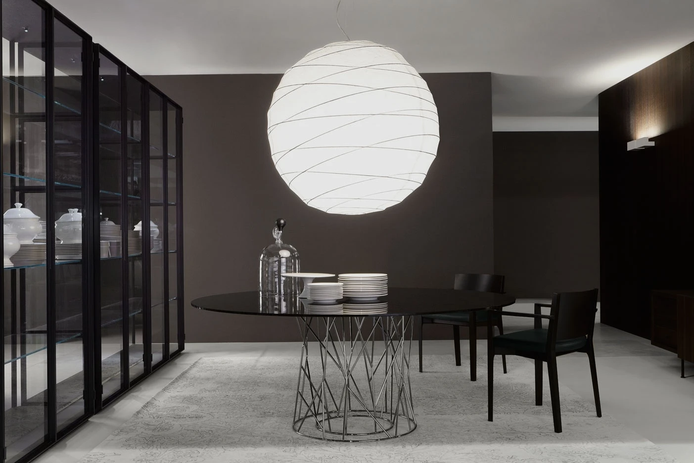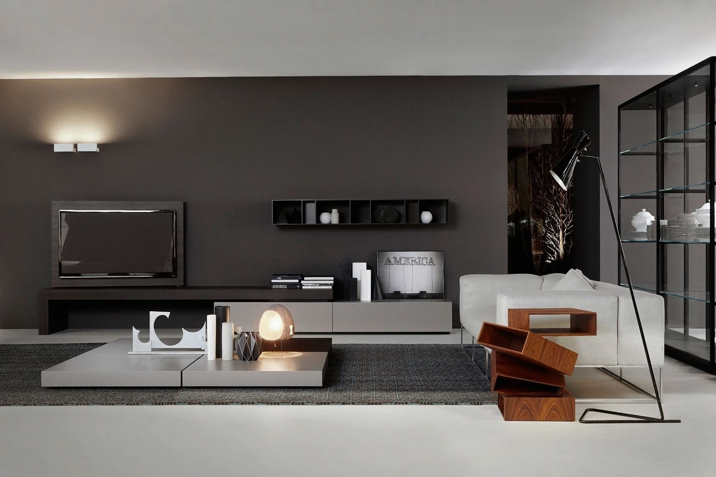 The second dining room environment features the new round version of the Synapsis table, Como chairs, an Ex-Libris bookcase/cabinet, the Tiller low sideboard, while the living area, including inviting Living Divani sofas, proposes some low Ghiaccio chairs, Balancing Boxes storage units, Modern benches, Showcase Table table-cabinets and Modern with Flag TV panel and a horizontal Sidewall hanging unit.