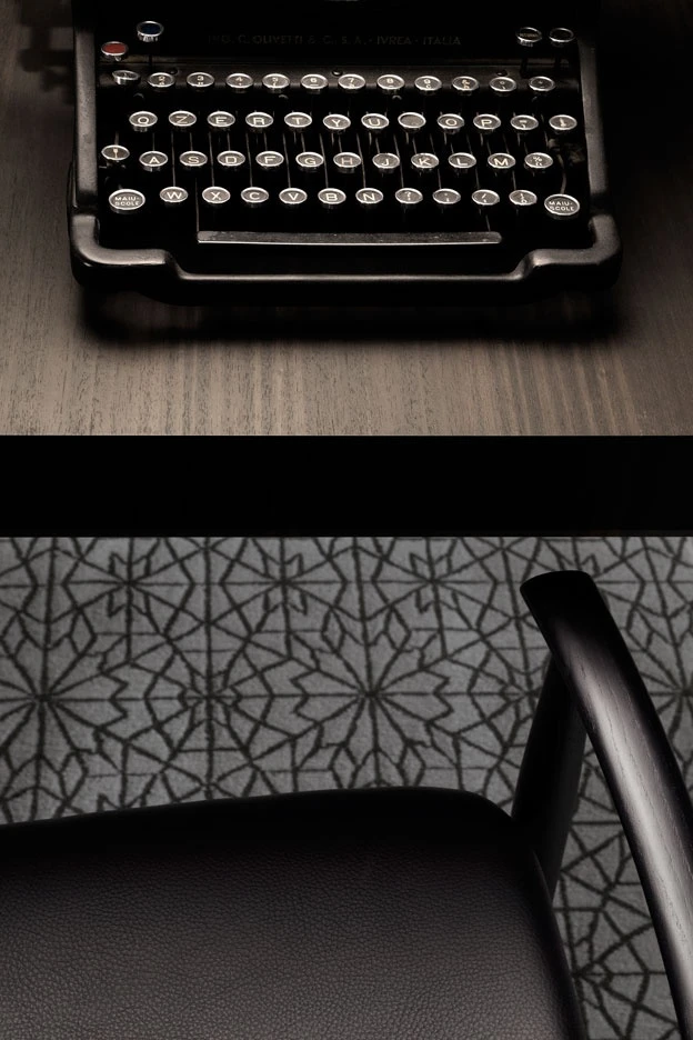 In the bedroom , an office area is composed of a Load-It bookcase, a Modern desk and a Conch chair. Clothes are stored in Storage wardrobe, while Shin bed is presented with a black Truck stepped night table, two white Offshore night tables, the inlaid drawer unit Inlay and Ghiaccio armchairs.