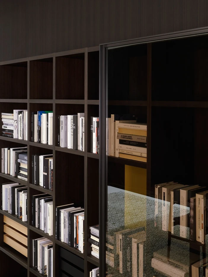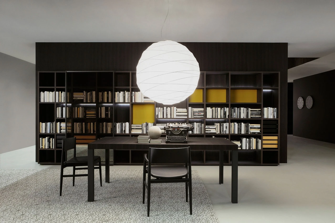The office environment is designed for those who want to bring the elegance, warmth and minimalist design characteristic of Porro residential settings to the workplace. It features Neve chairs, Taac extensible table and modular System bookcase in the background.
