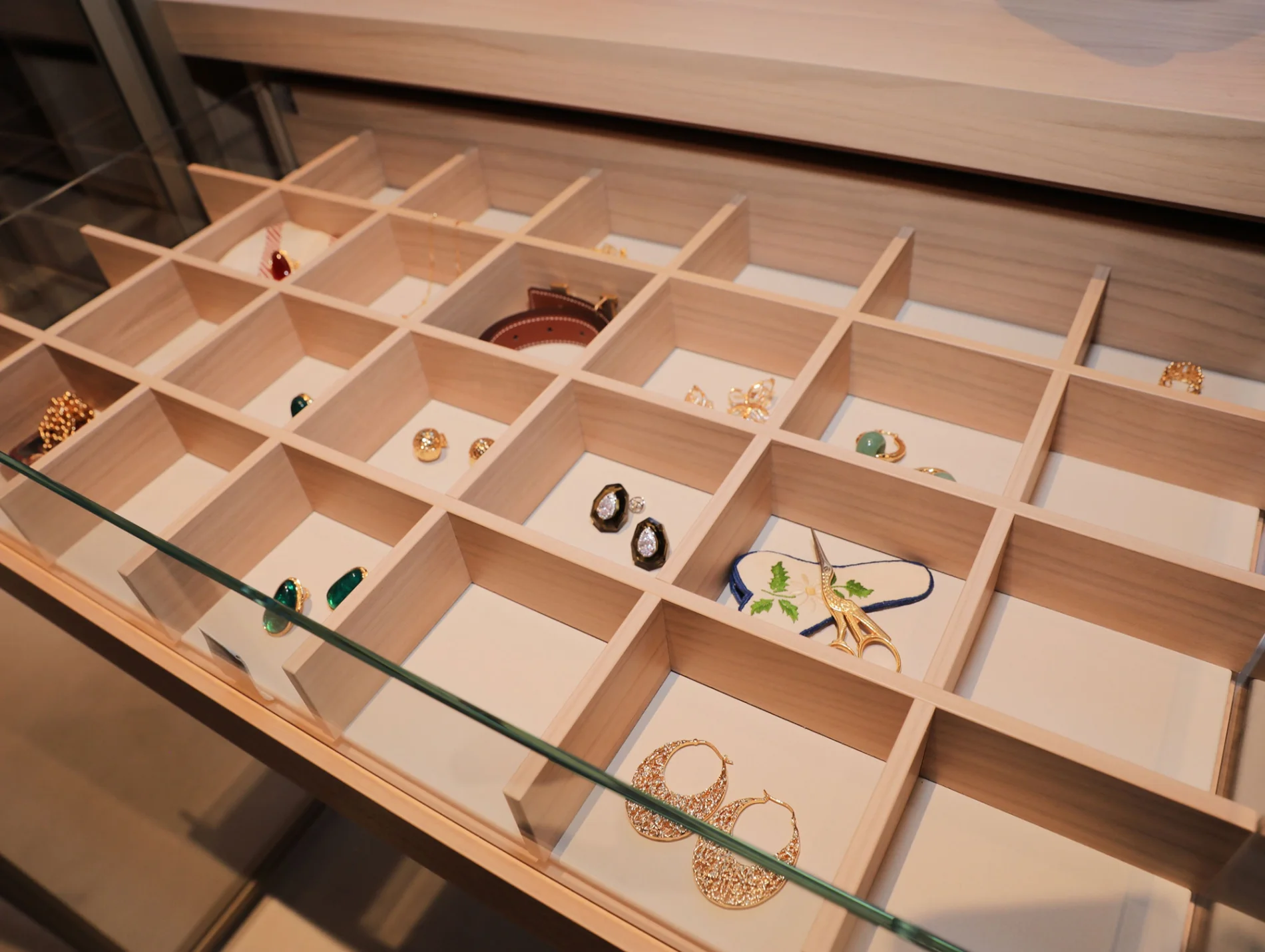 For the occasion, the Porro home came to life through an original dialogue between design, light, accessories, and precious objects: lamps, sunglasses, and jewelry were displayed inside the wardrobe area, whose sober and refined design is conceived to accomodate and showcase personal belongings.
