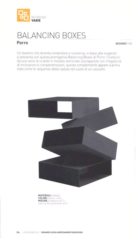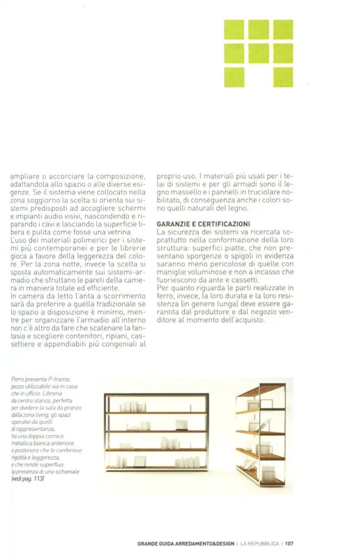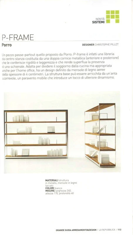 P-Frame bookcase, Balancing Boxes small table and Neve chair reprensent Porro in the guide “Arredamento&Design 2011-2012 – la Repubblica”, which collects the latest novelties of the design industry, with more than 300 products and a directory of top design professionals.