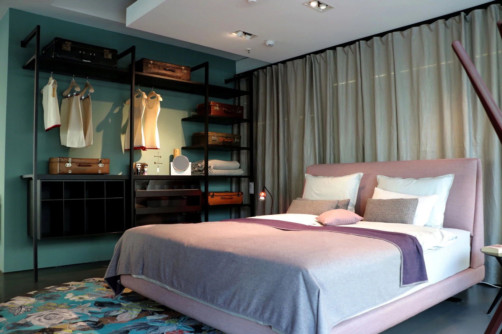 Rich materials add visual interest to the simple structure of the Storage walk-in closet next to the bed, presented in “carbone” oak with coordinated black lacquered uprights.