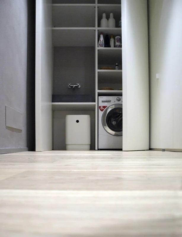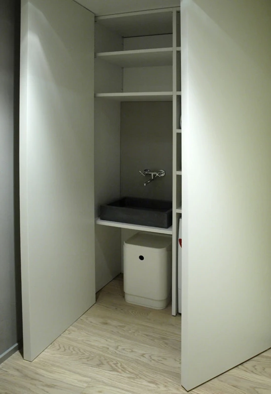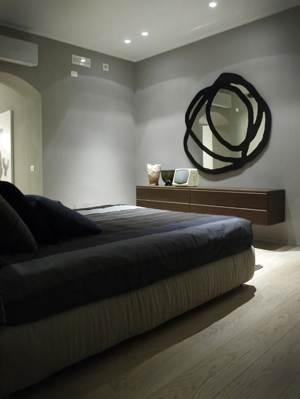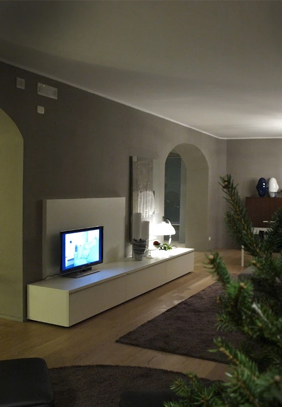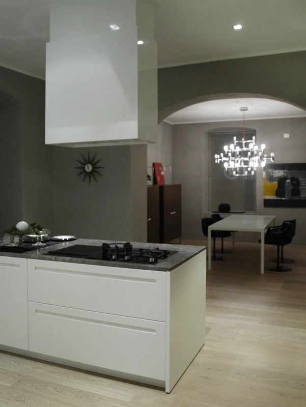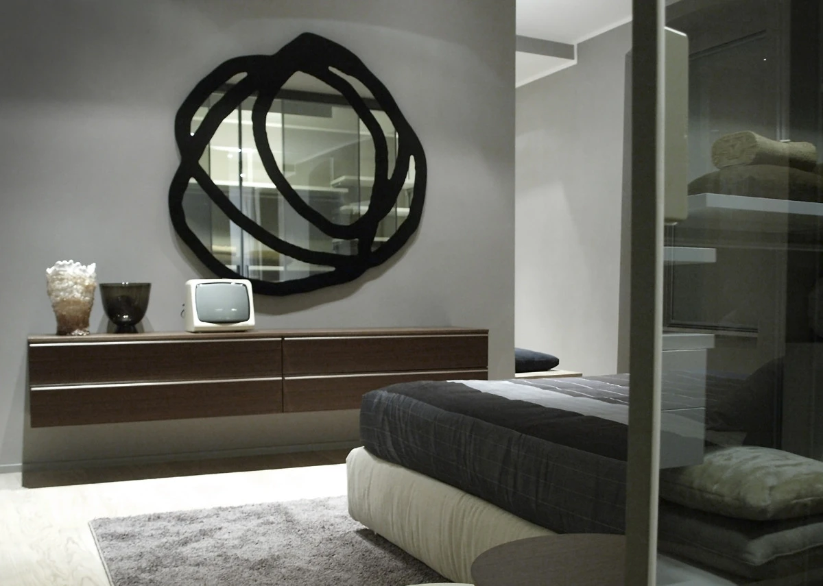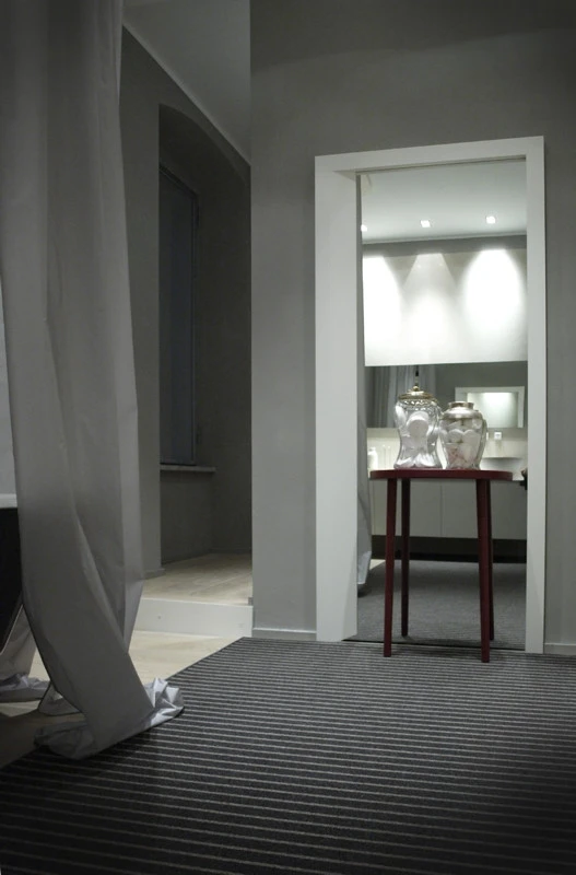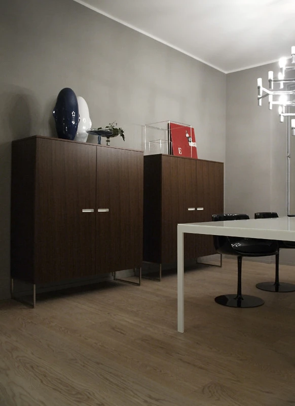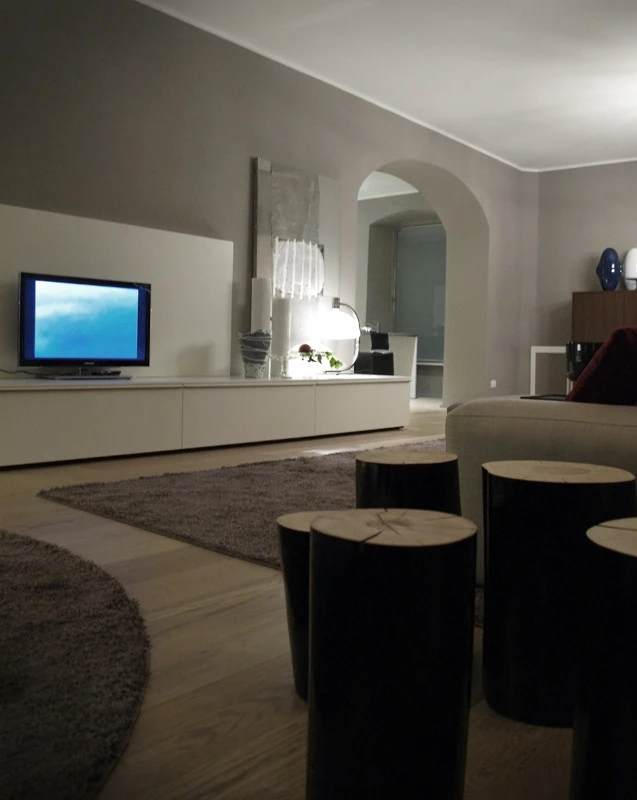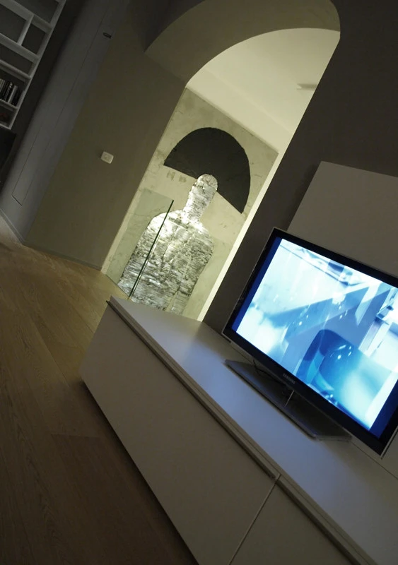 Connected to the homonymous showroom, via Cittadella 29, through an inner staircase, it looks like a real apartment furnished with the proposals of the most important design companies, to lead the visitors in the choice of up-to-date materials, finishes, and objects,such as Fractal table, with white lacquered aluminium legs and white back-painted crystal top, Modern tv composition for contemporary living areas, Mirror Table, incorporating a console and Storage wardrobe.