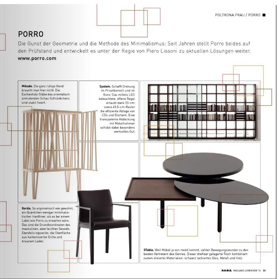 The movement of the 3Table small table, the sophisticated “now you see it, now you don't” effect of the Mikado cupboards and the new easy chair Garda, are the pieces of furniture chosen by H.O.M.E. magazine to represent Porro inside the Milan Lookbook 2013, for their ability to catch the current design Zeitgeist. Complete the selection System in eucalyptus wood, a modular arrangement, characterized by traditional open shelving with the 33 cm module offering compact compartments in which to store books or CDs, or display objects.