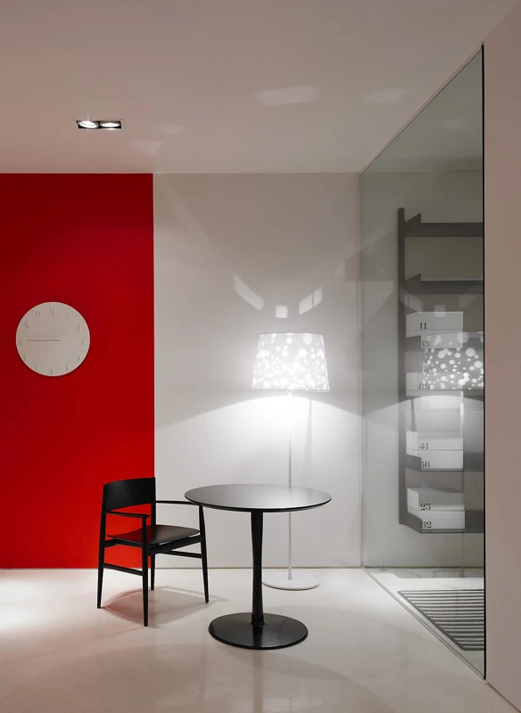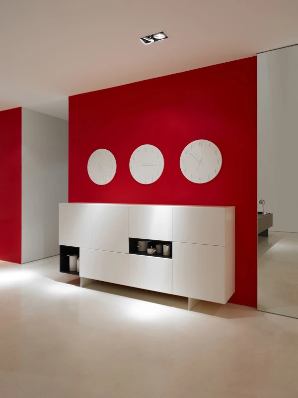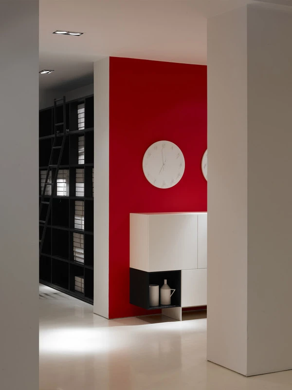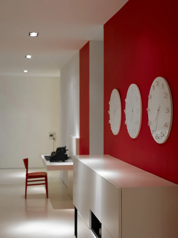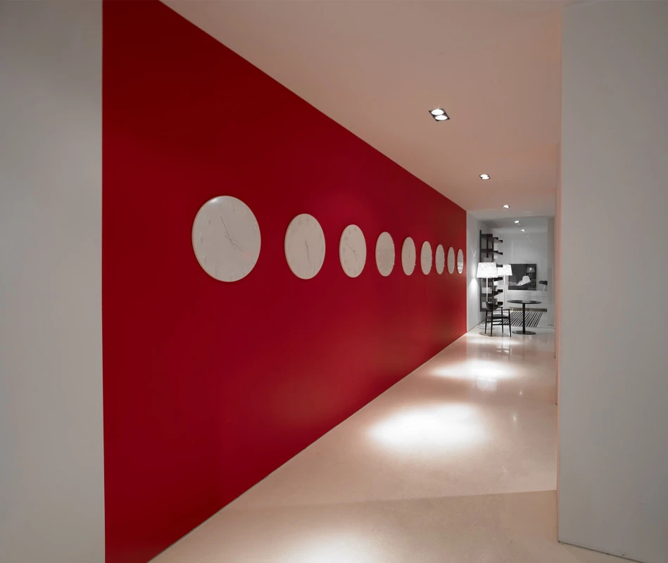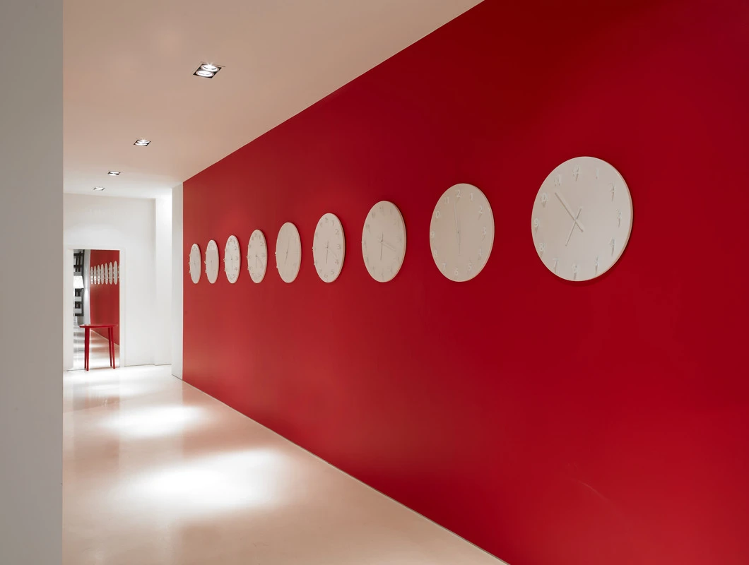 In a red coloured exhibition space, where even the showcases are transformed into large clocks that mark the passage of time with their matt silver and red hour and minute hands - lights scenographically illuminating the street - the latest creation, born from the association between the designers and the contemporary furniture brand which is famous for its immediately identifiable style and the high quality of its proposals stands out on the wall for its whiteness and perfect circular form.