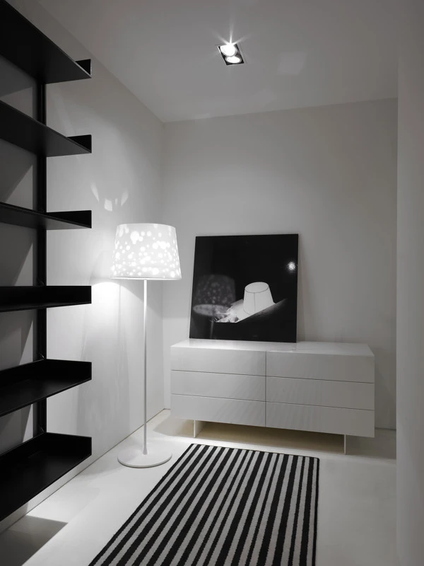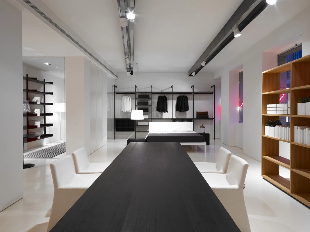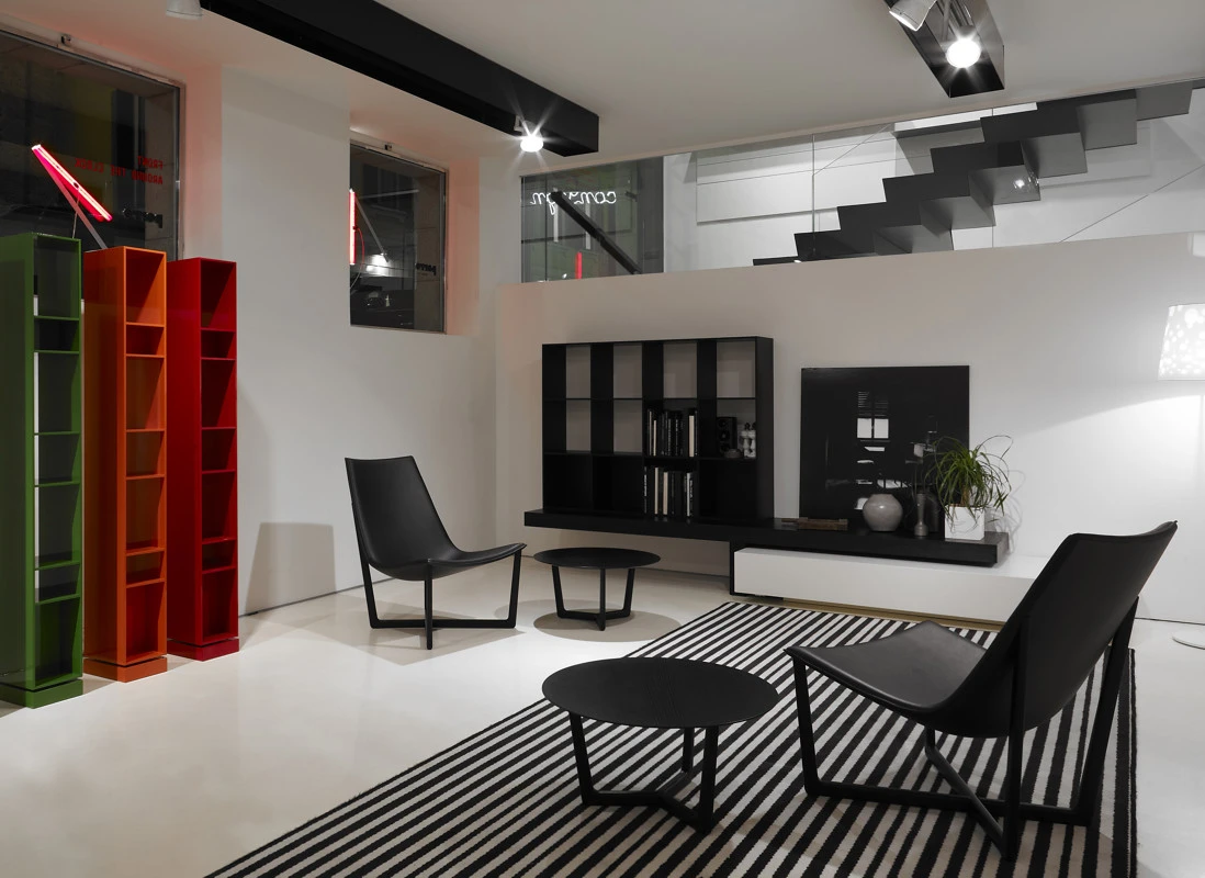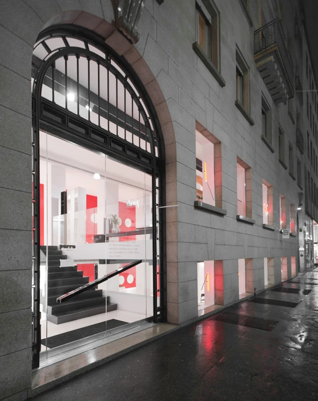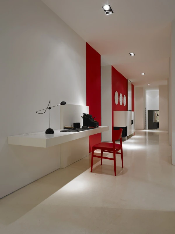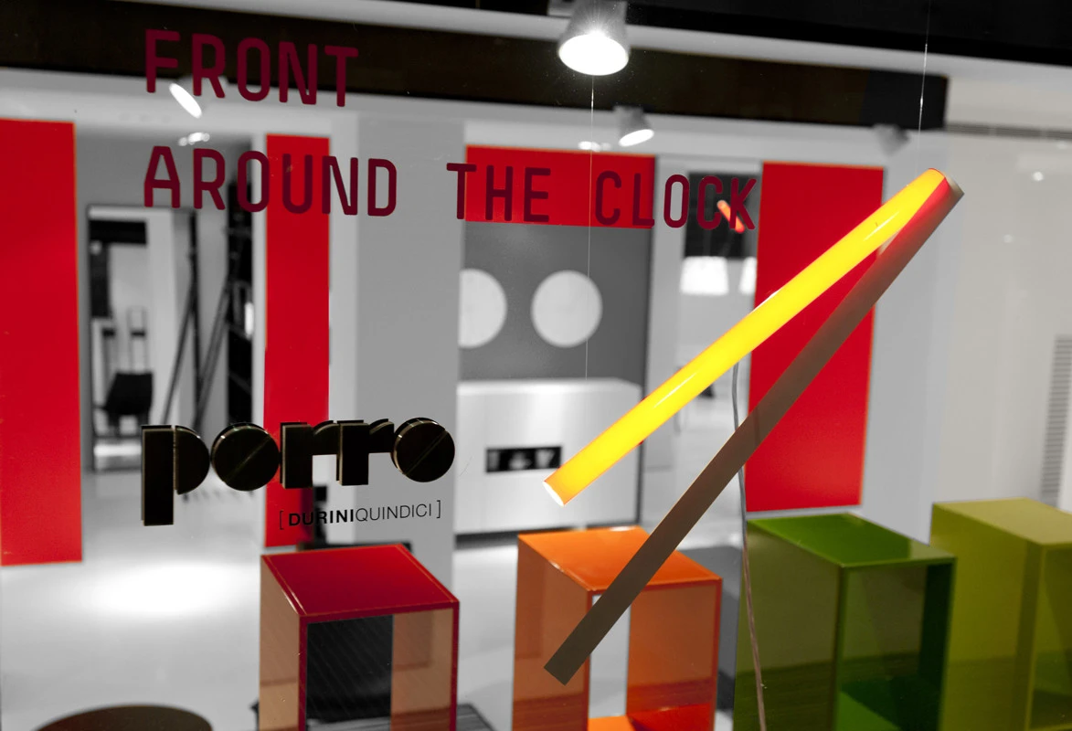 In a red coloured exhibition space, where even the showcases are transformed into large clocks that mark the passage of time with their matt silver and red hour and minute hands - lights scenographically illuminating the street - the latest creation, born from the association between the designers and the contemporary furniture brand which is famous for its immediately identifiable style and the high quality of its proposals stands out on the wall for its whiteness and perfect circular form.