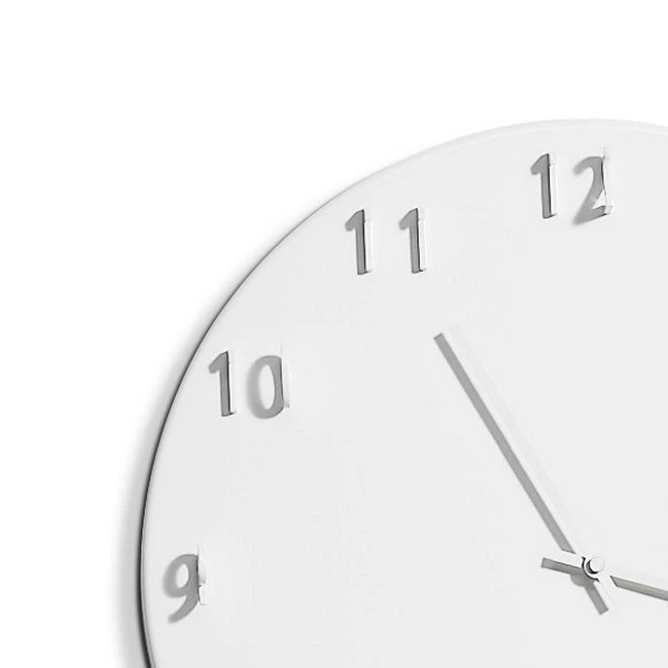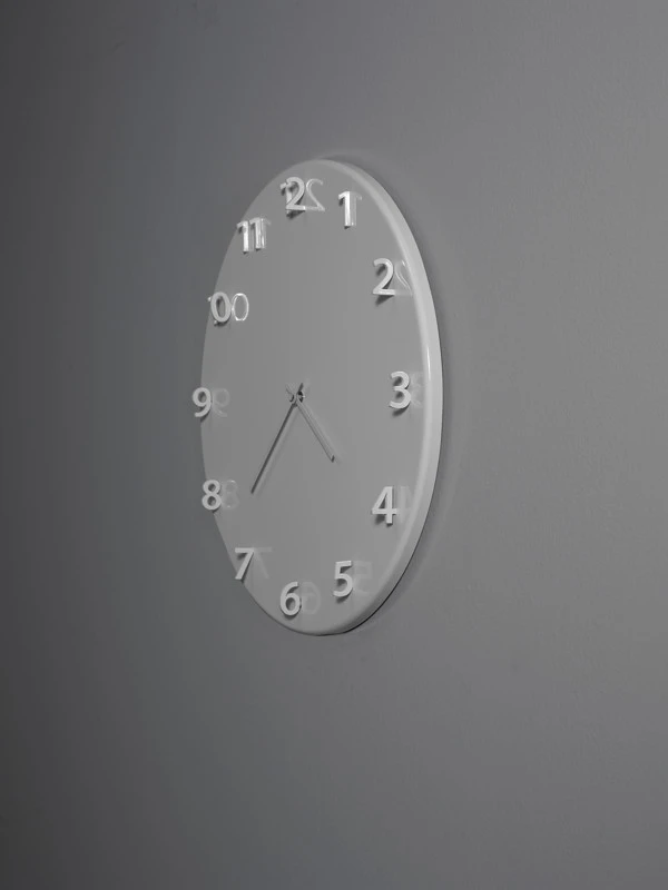 A metal disk with a diameter of 55cm presents the 12 hours applied perpendicularly to the base, which are only legible by their shadows cast on the white surface. This is an unusual solution, which when seen frontally