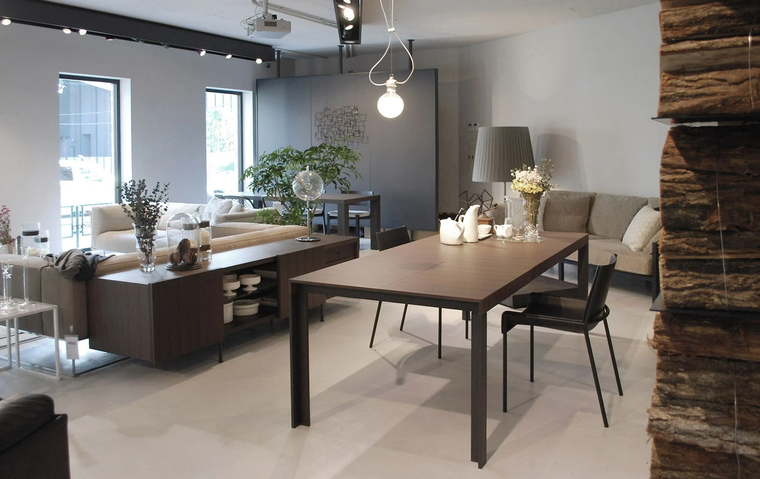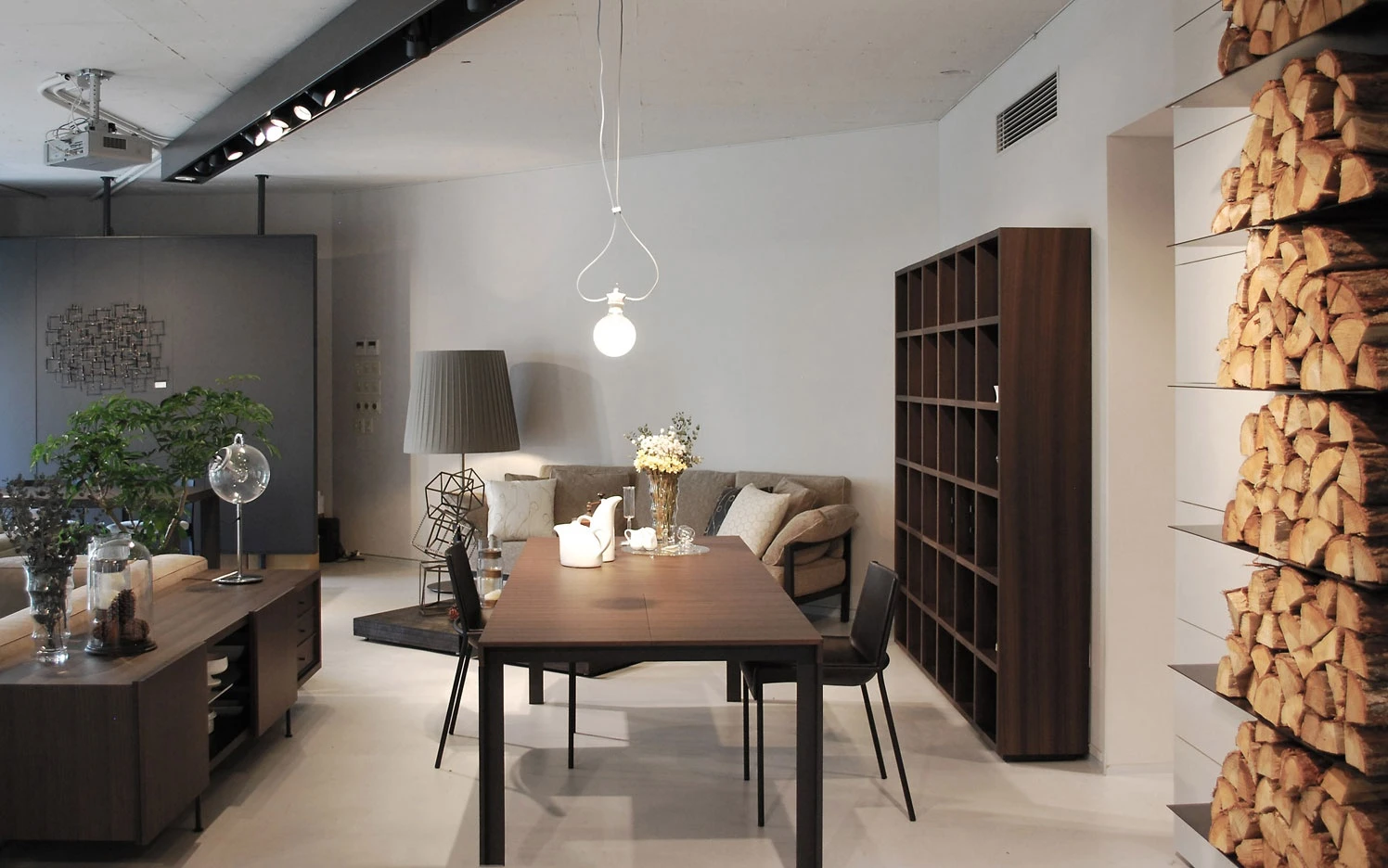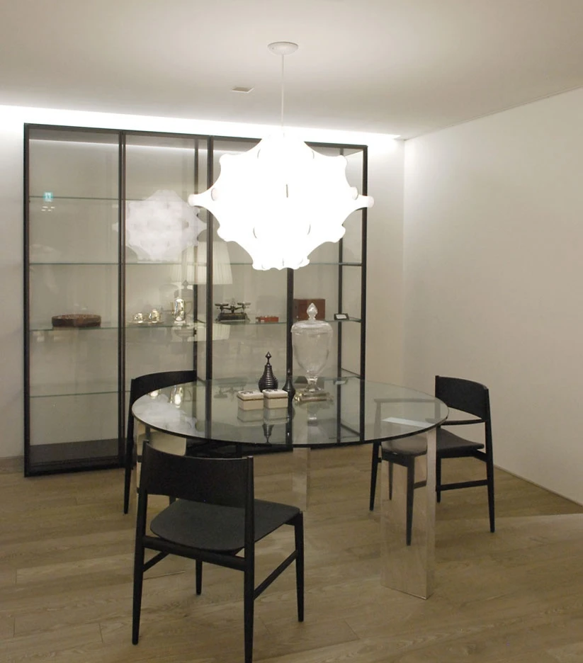 A second dining room shows a round Beam glass with tempered glass top and polished aluminium legs, the Neve chairs in black stained hemlock and an Ex-Libris bookcase/cabinet with glass back and side panels.