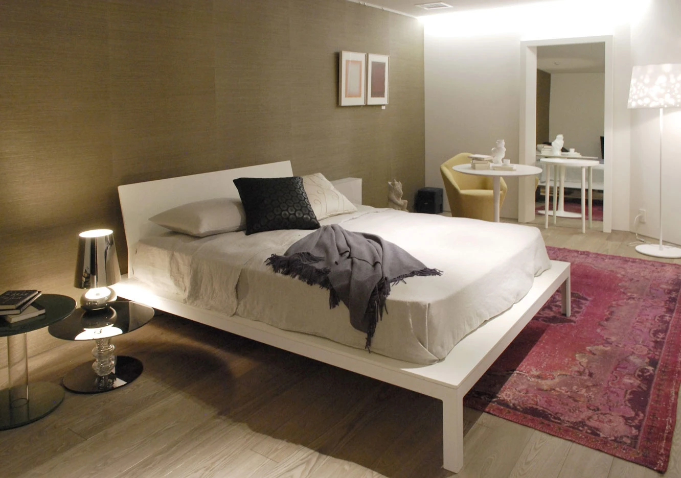 In the bedroom, the intimate shapes of Offshore bed, composed by a white metallic structure and white lacquered headboard and frame, go with the light games of Shadow Light lamp and Mirror Table, a door opening up to an imaginary room.