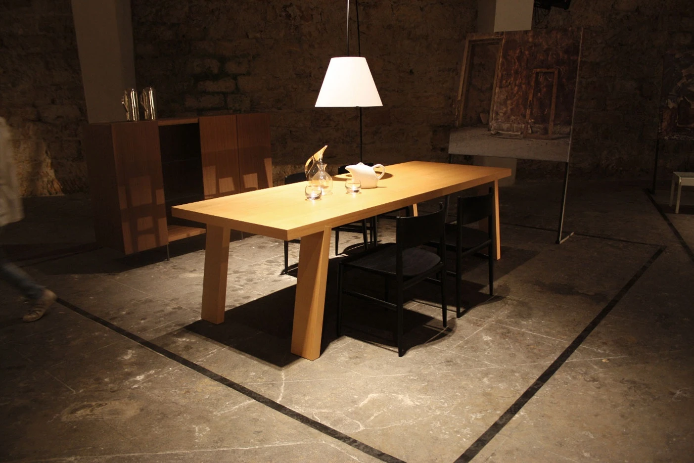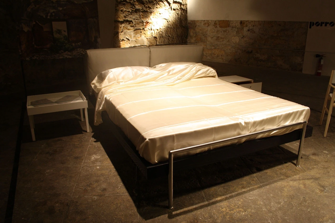 The high sideboard Tiller in eucalyptus fitted with 4 doors to be opened one of the other, pleasantly changing the front pattern, the Inlay sideboard, made according to an accurate inlaying processing, alternating 4 oak tones with a dark profile, the white Modern unit on a Lama foot, the Shin bed with big leather cushiona followed by Balancing Boxes bedside tables, the Lipla bed with its sinuous lines together with the Truck bedside table, the black Synapsis table with an crossed base unit and the Never chairs with the rigorous lines and a catalogue classic, the Como armchairs.