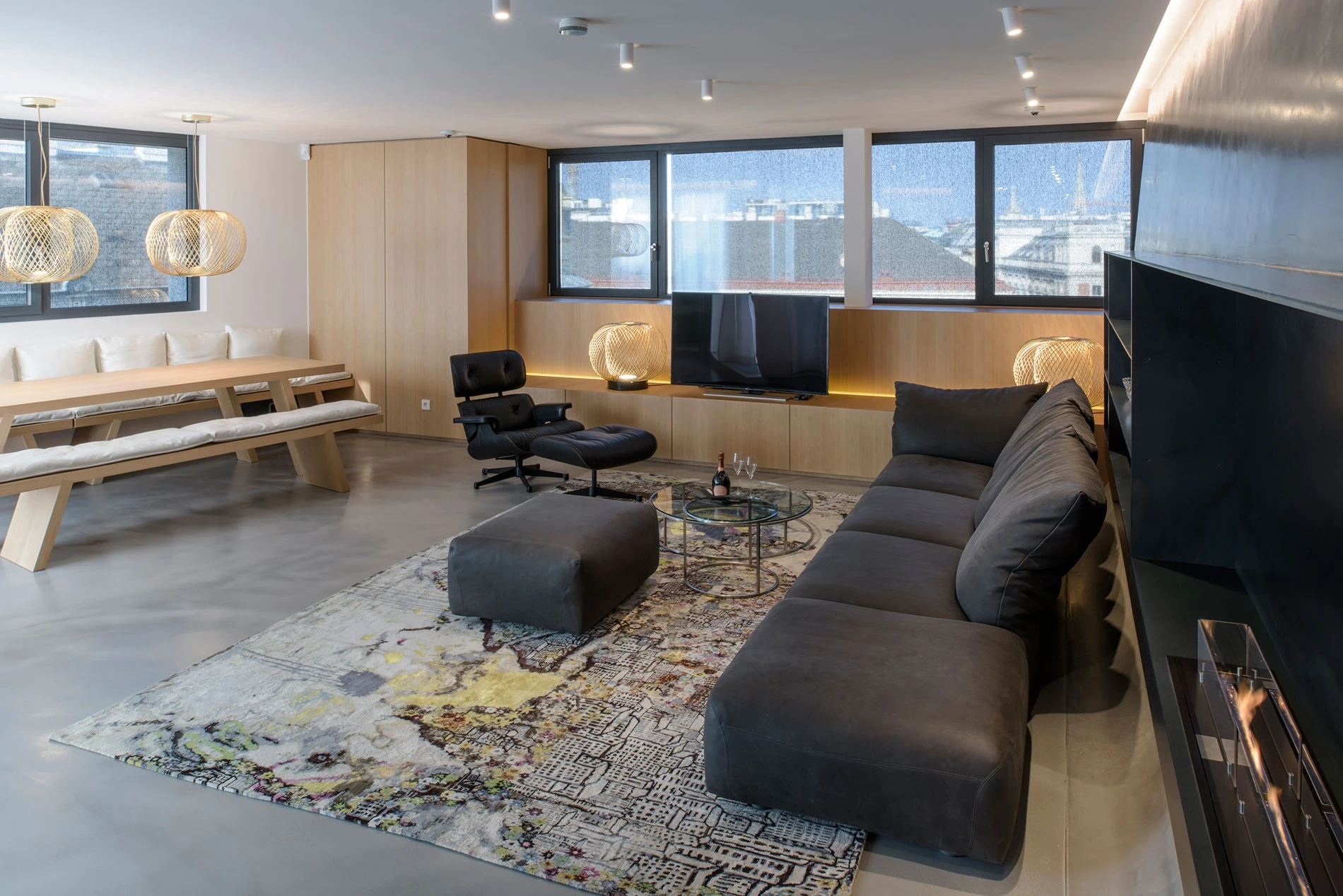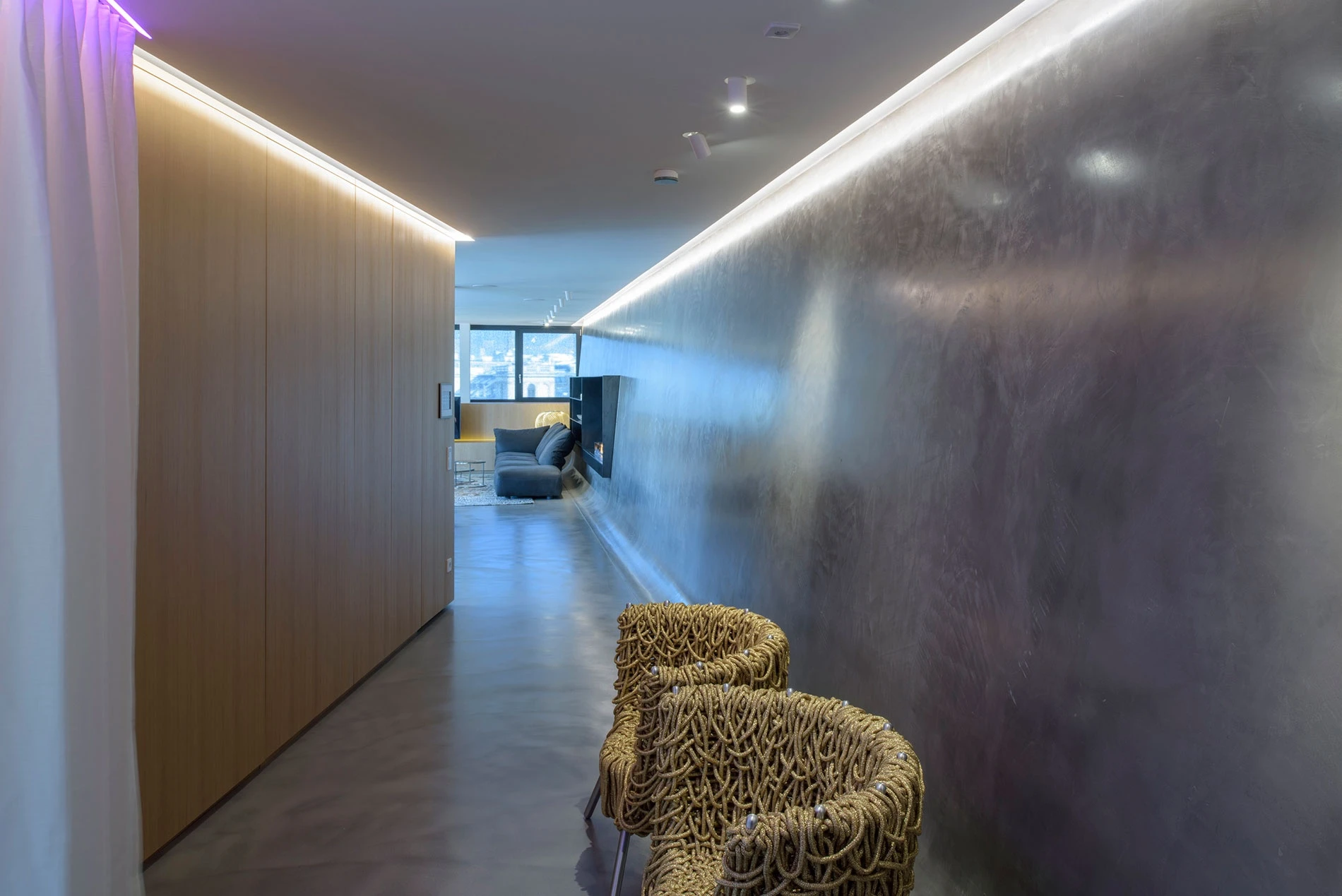 The first apartment, with a warm and cozy style thanks to the Porro panelling system in natural hemlock, proposes in the dining area next to the kitchen by Steininger the Minimo table and the Groove bench in the same essence, with a Japanese aesthetics. Even the Storage walk-in closet is presented in hemlock, in the “cenere" finishing enclosed by Iron doors with metal profile, for a more precious effect.