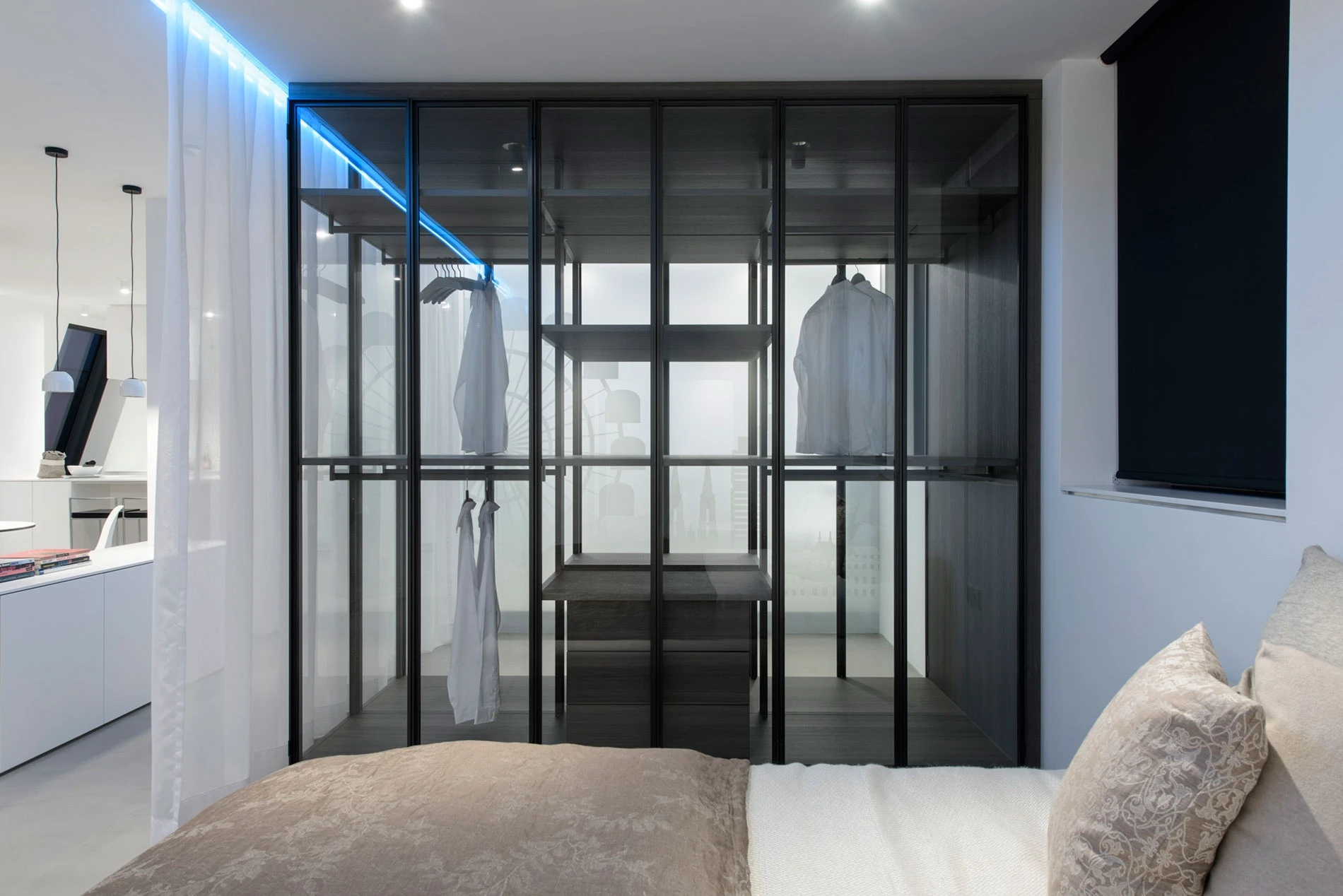The second loft characterized by a more graphic and clean style, transforms the bedroom into a glass cube, created by the rigorous lines of two Storage Air self-standing walk-in closets. The pure white surface of the walls is matched to “carbone” oak, for an effect of strong impact.