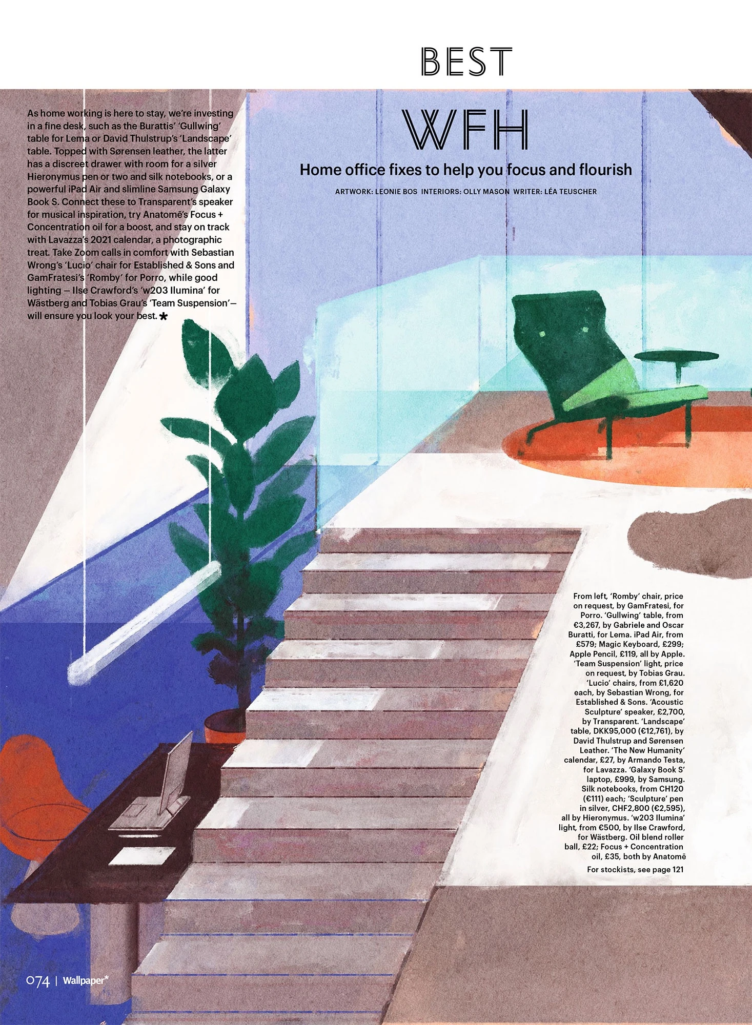 What a bright start in 2021! We are pleased to announce that our Romby chair designed by GamFratesi has been appointed “Best WFH” of the Wallpaper Design Awards, selected among the home office fixes to help you focus and flourish! As home working is here to stay for a while, Romby is the ideal solution to take zoom calls in comfort, as in the colorful artwork by Leonie Bos with the interiors by Olly Manson, on the pages of Wallpaper February Issue. Softness and geometric impact, excellent craftmanship and simple design characterize this new born chair, iconic piece of Porro’s 2020 collection.