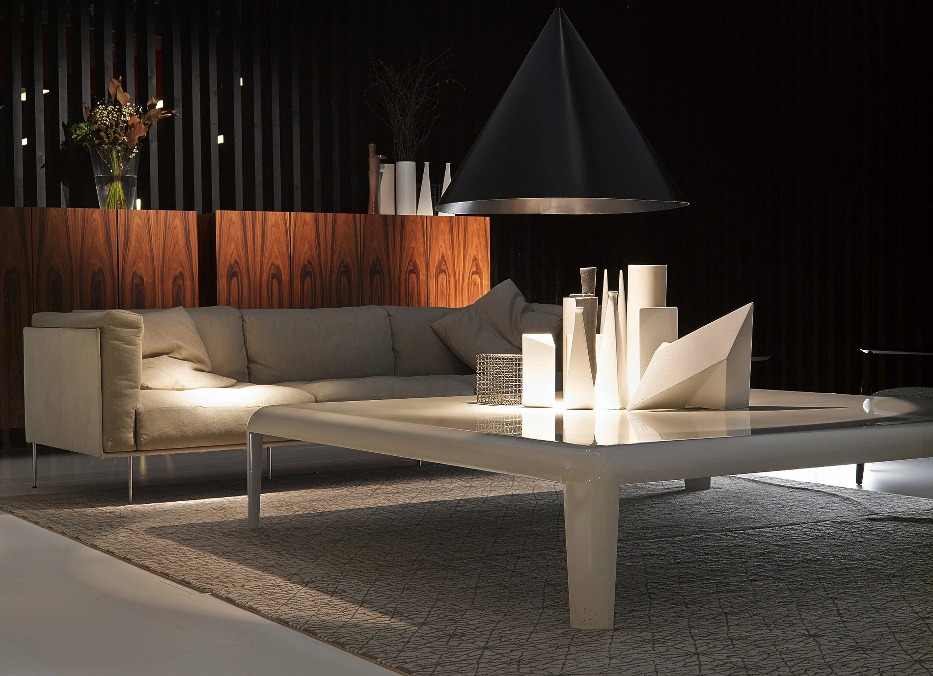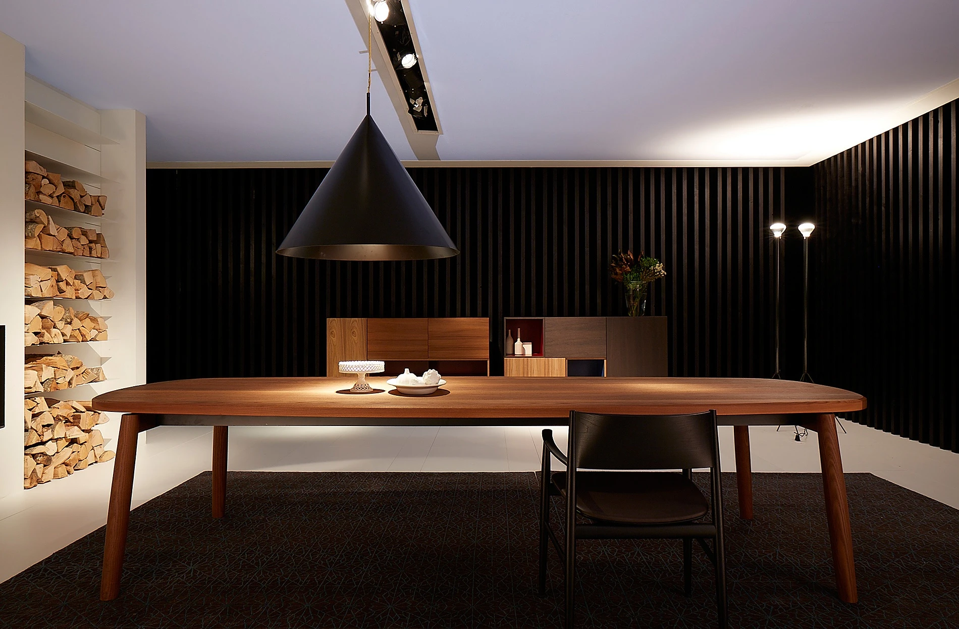 In the first dining room setting, the new Galileo table by Piero Lissoni makes its debut, featuring organic contours in heat treated ash thanks to its solid wood table top supported by four thick tapered legs. In the background System, the modular system with the typical open shelving making it a unique furnishing proposal for the house and the office here, displays firsthand all of the colors and textures of the Porro’s new wooden essences, while on the right-hand wall, 2 new Modern cupboards, raised up on a continuous base, play upon the geometric construction of open elements with rosso cina and blu reale lacquered backs and closed volumes in three of the new wooden essences.
