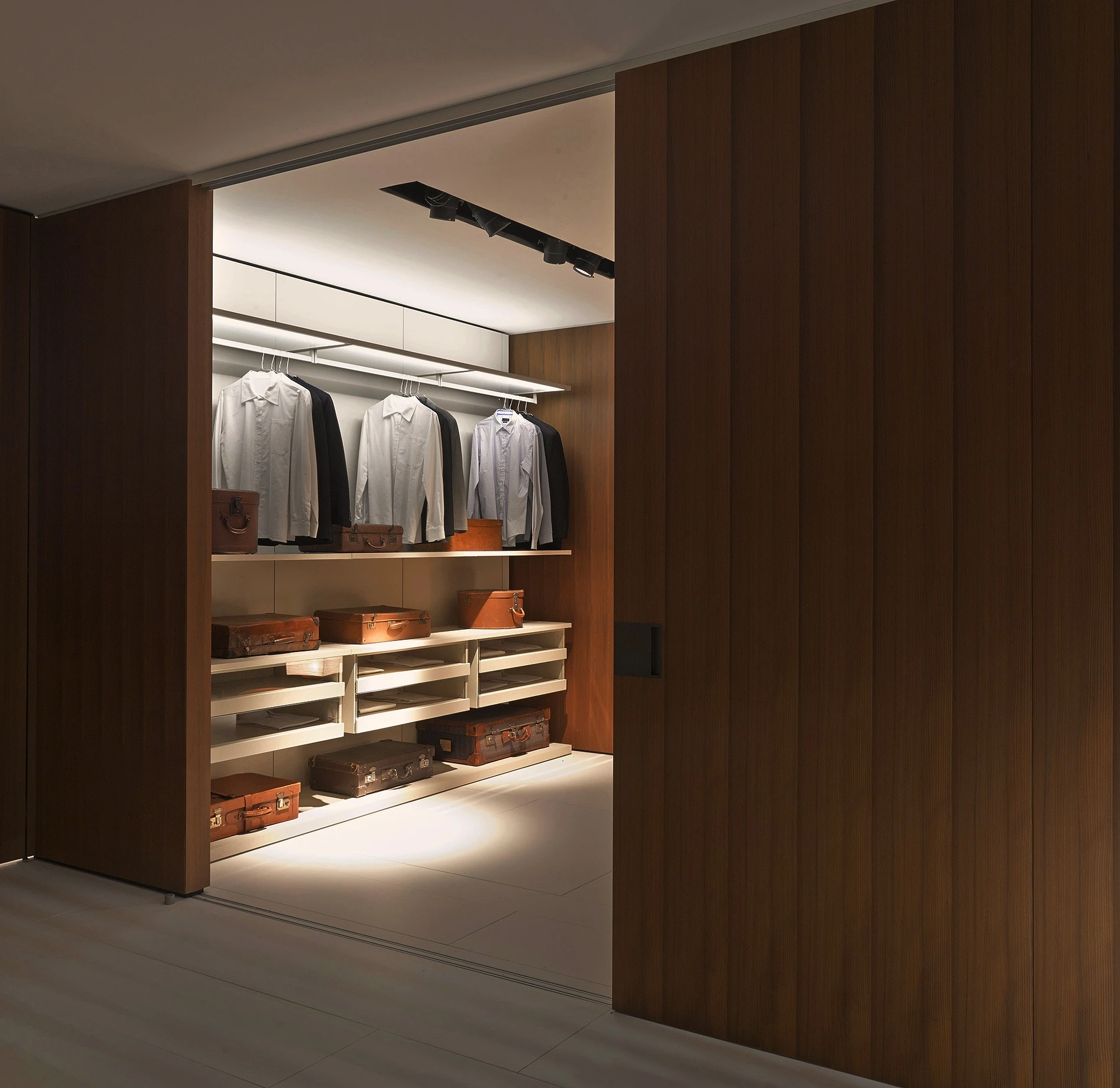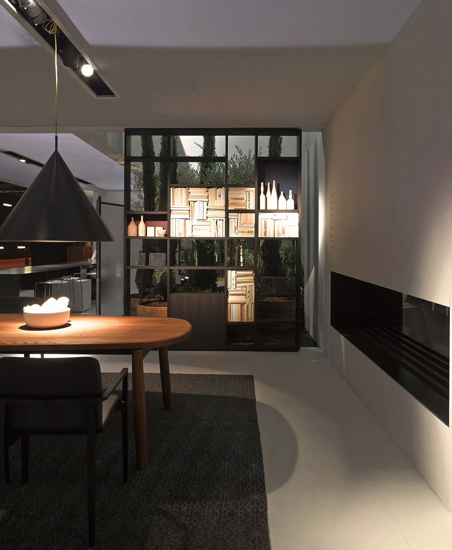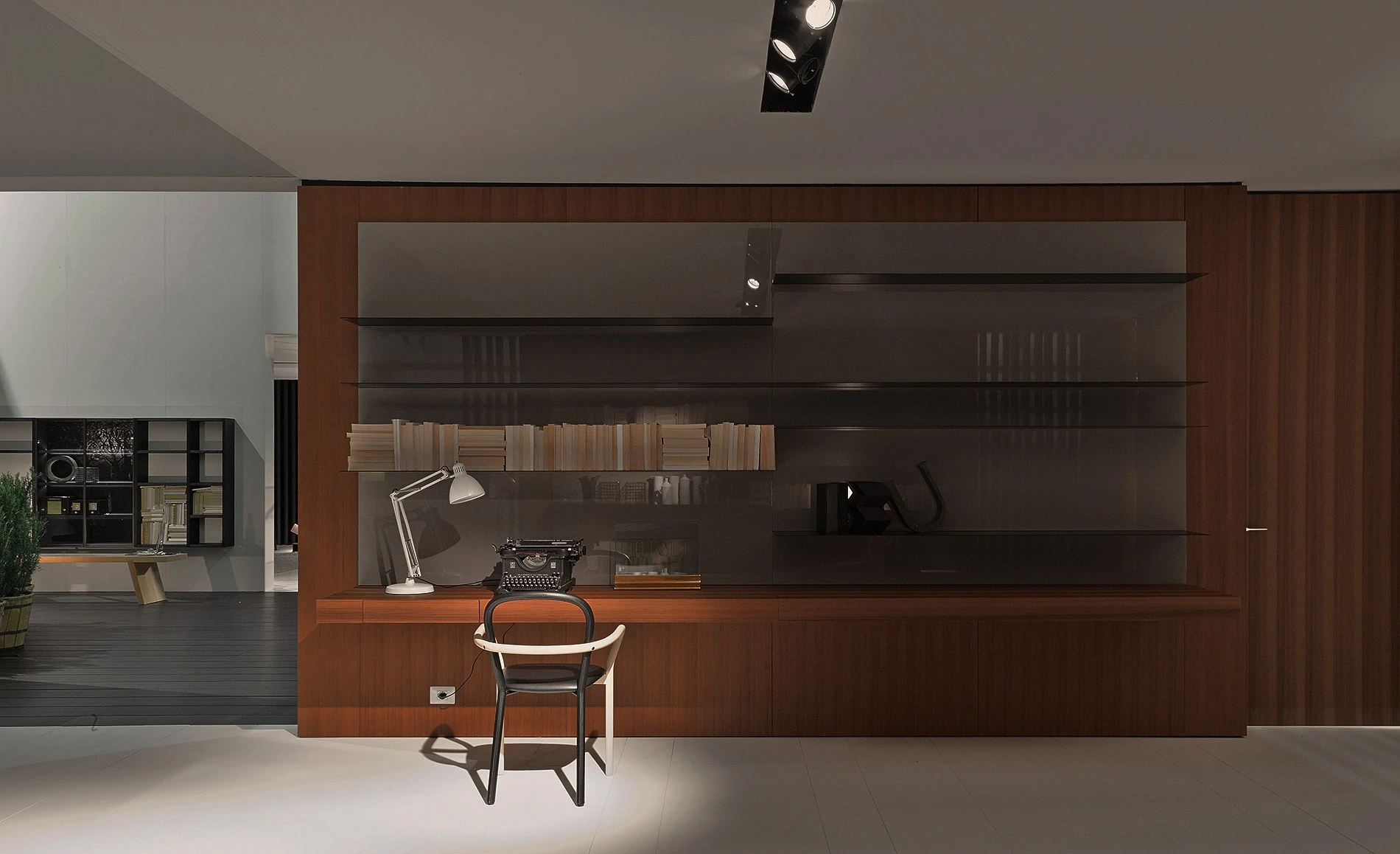 The study area shows the new Papier wall by GabrielPolloni Associati and Piero Lissoni in heat treated tanne, a tactile continuous material surface, flexible and customizable, that can be interspersed with hinged doors to connect different spaces.