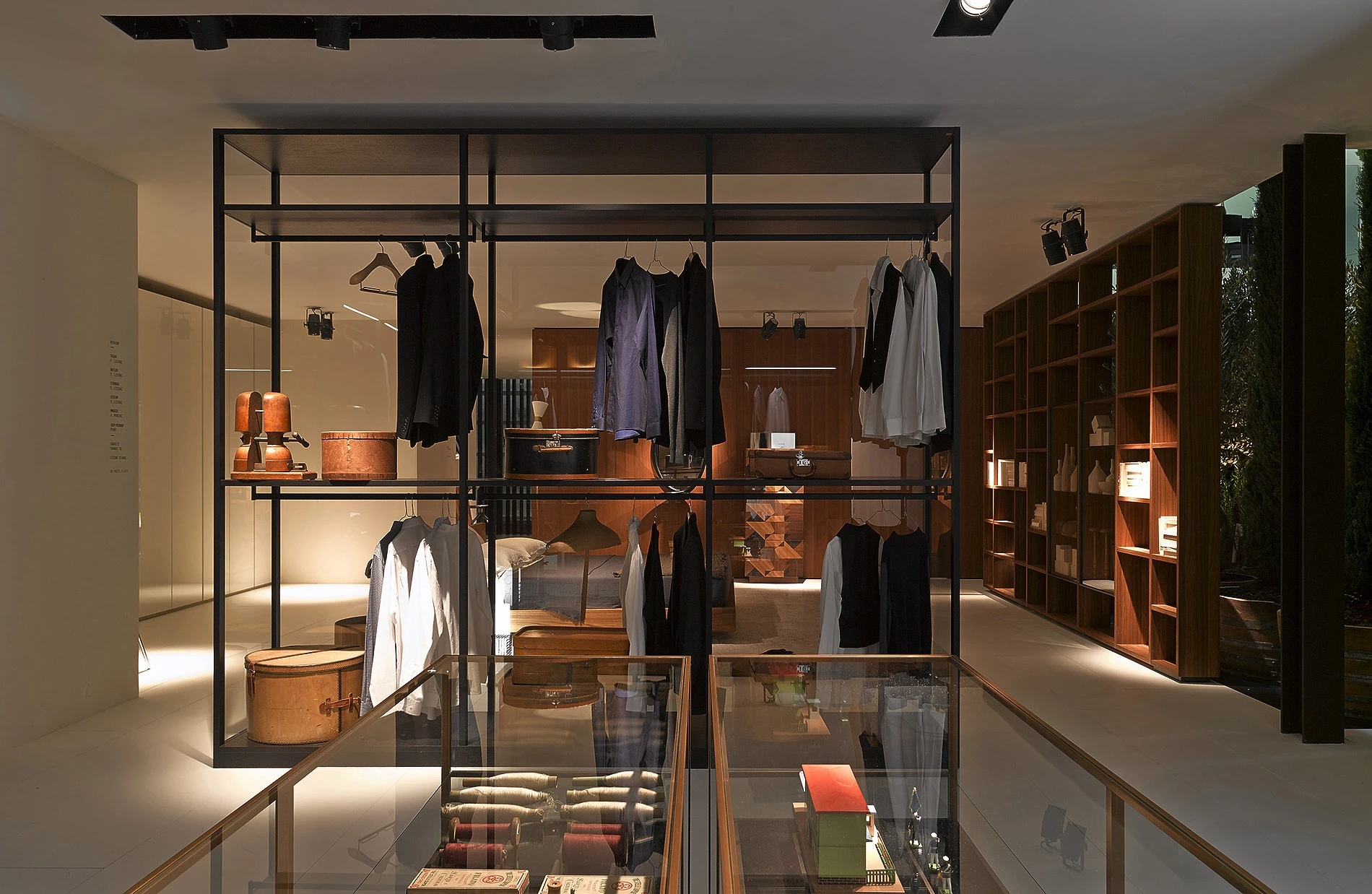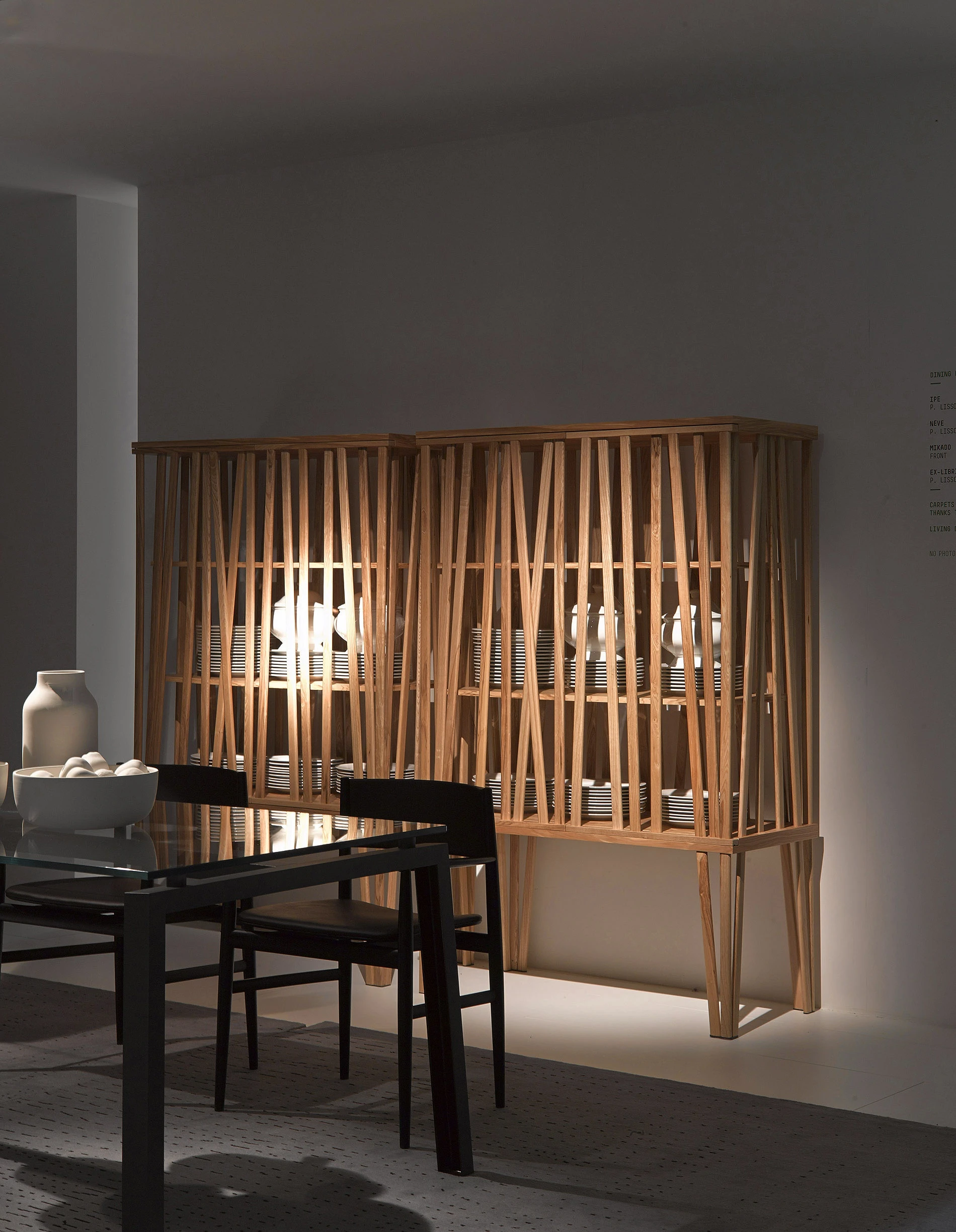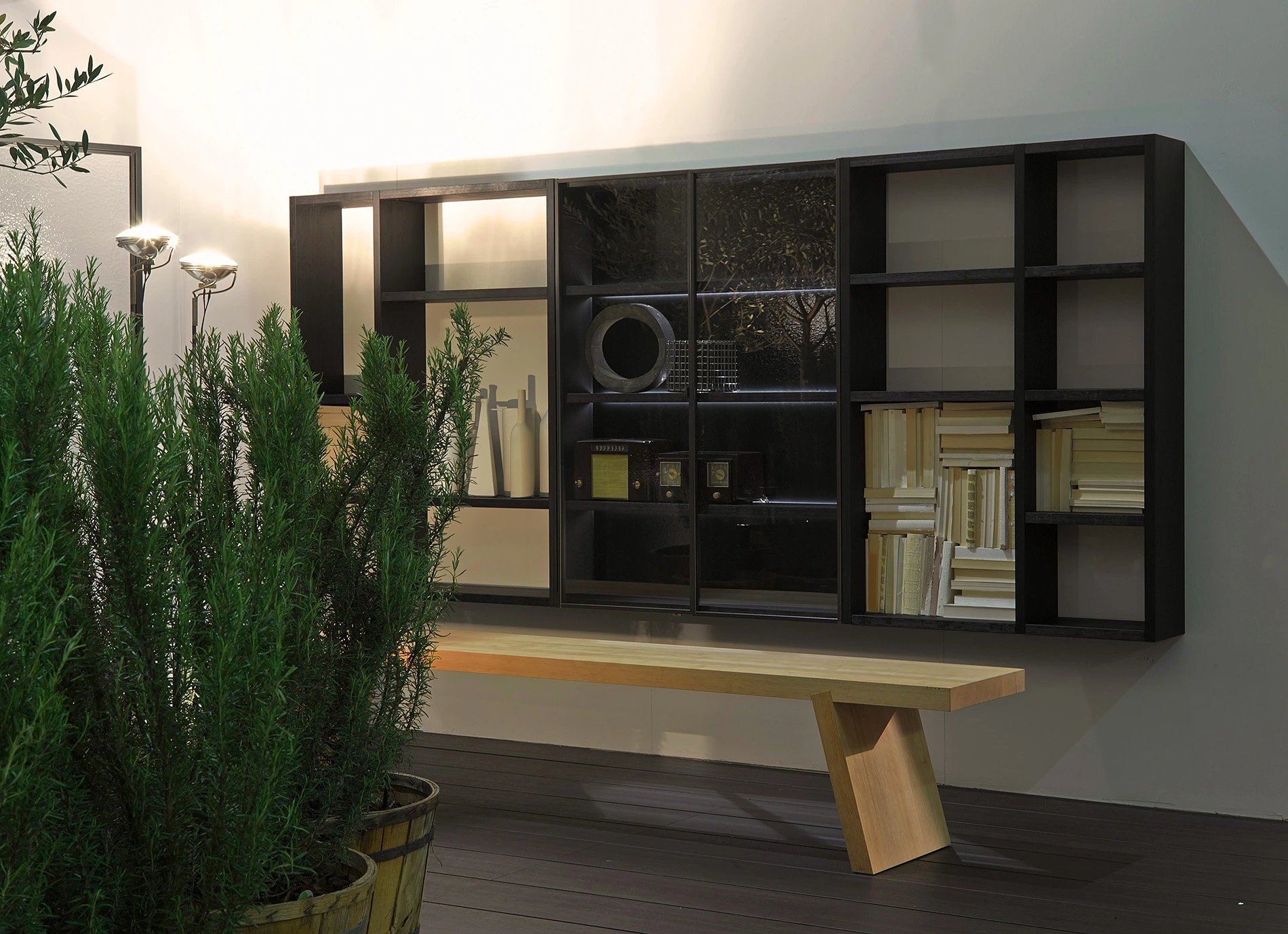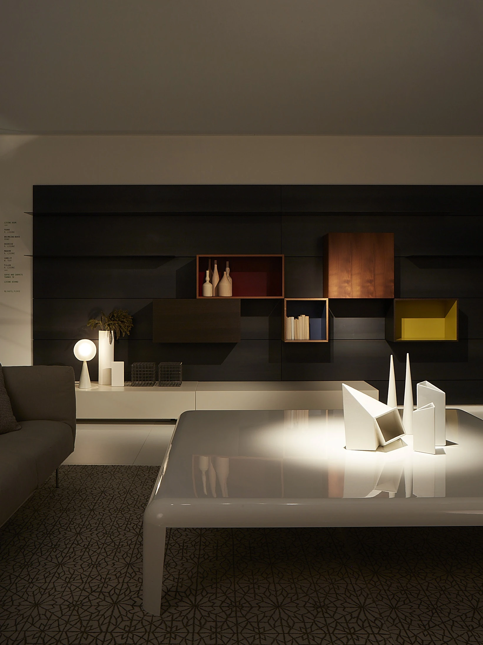 The study area shows the new Papier wall by GabrielPolloni Associati and Piero Lissoni in heat treated tanne, a tactile continuous material surface, flexible and customizable, that can be interspersed with hinged doors to connect different spaces.