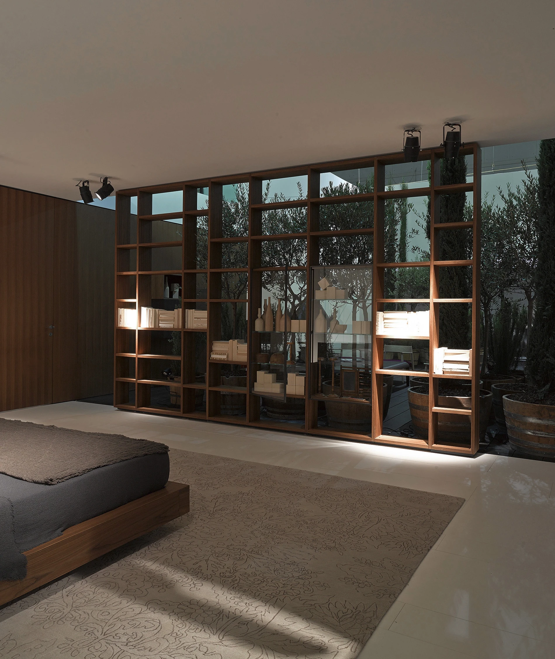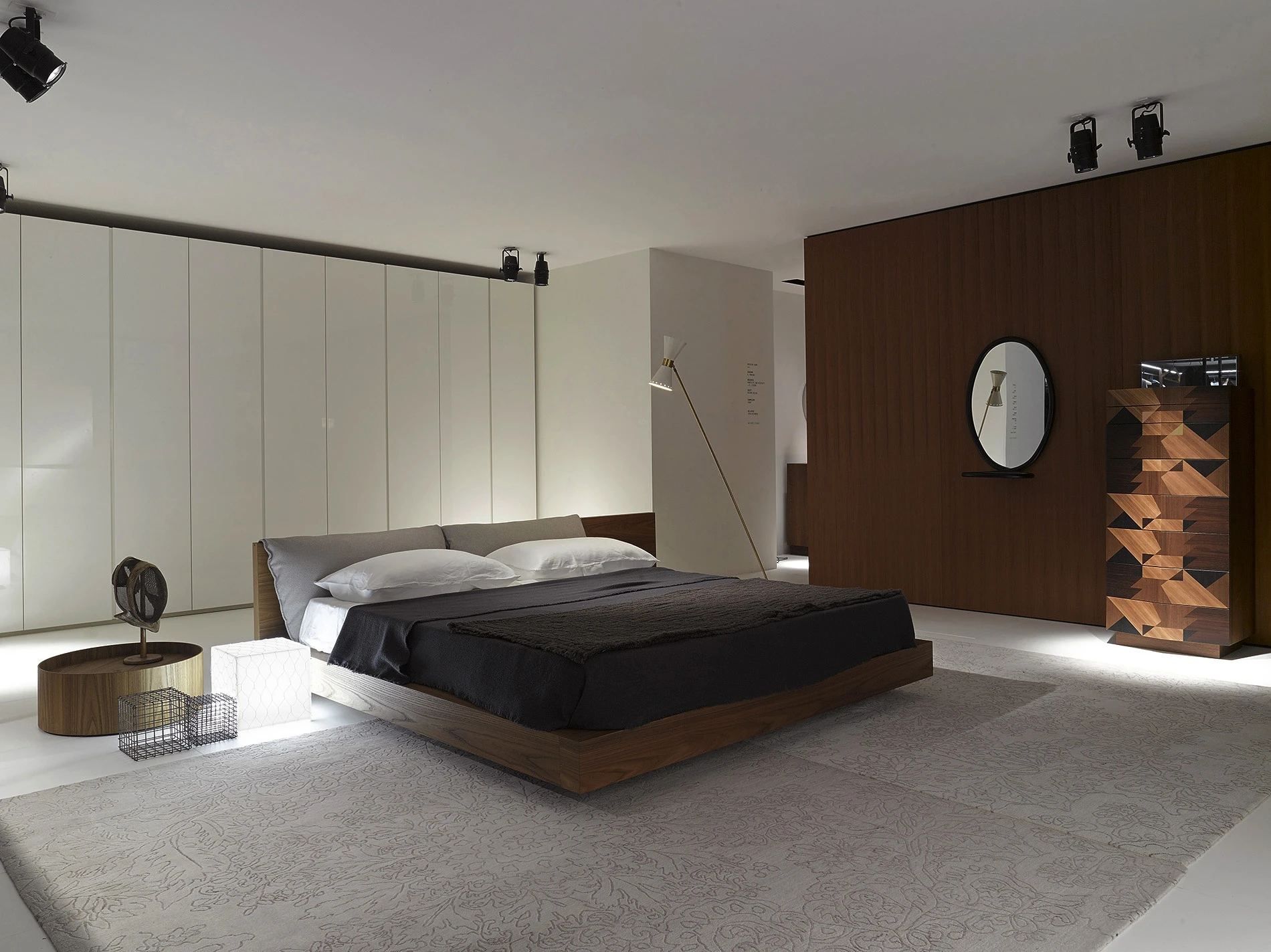 In the bedroom, the new Taiko bed by Piero Lissoni is the star: with its constant and welcoming volume in the warm notes and golden blonde color of the heat treated elm, and the trusted Butler cylindrical wooden bedside table. Created for storing everyday clothing is the narrow and elongated amusing Maggio chest of drawers, featuring an inlaid front, with a diamond-shaped section and crowned with a mirror, next to the Loop Mirror, contemporary reinterpretation of the art of carving, with its wooden frame knotted to create a loop, a protruding shelf which becomes a refined decorative detail, tracing in the space the symbol of infinity.