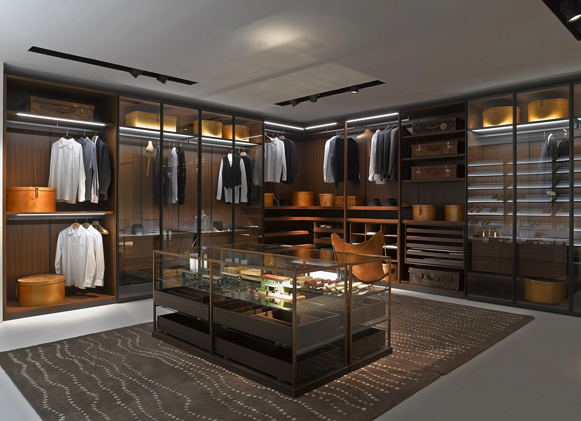 To create a secret room for your clothes, the second dressing room is presented in a large horseshoe-shaped composition, in the expressive finishing of mongoi. In its centre, the new Acquario drawer unit, made in transparent glass with metal profiles, divided in 3 shelves and customizable with wooden trays which leave the contents visible, in order to store them in perfect order and then extract them with ease.