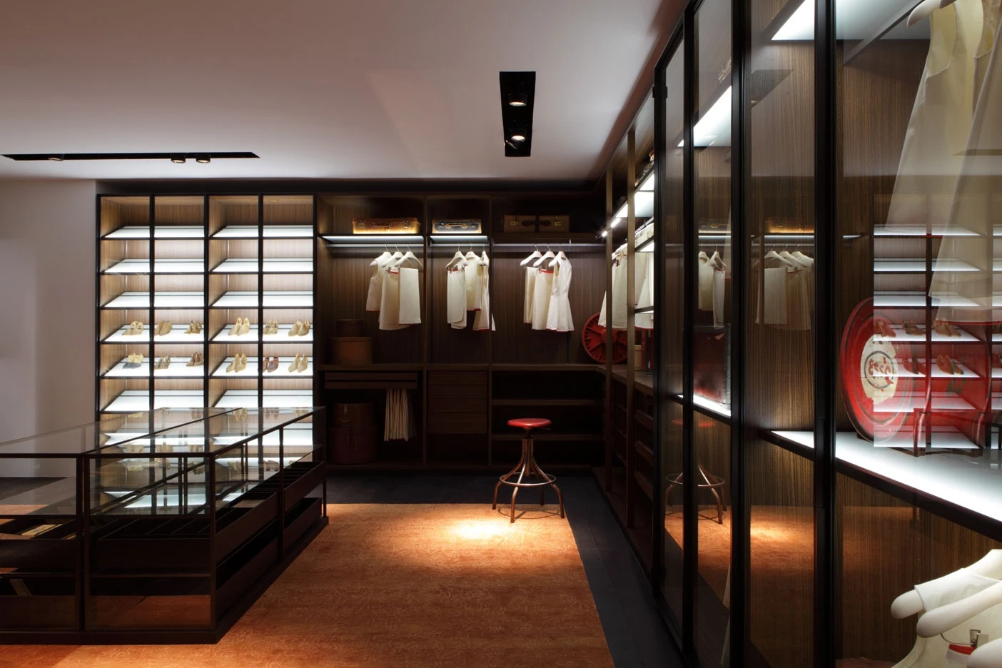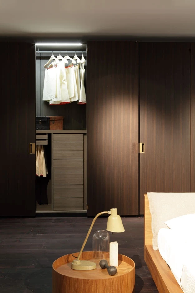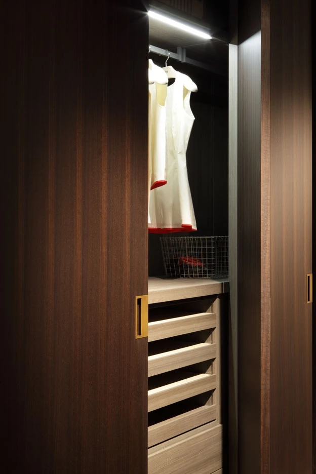 To create a secret room for your clothes, the second dressing room Storage in presented in an expressive finishing as mongoi and a wide corner composition, alternating open units and closed units with transparent glass doors with Iron frame.
