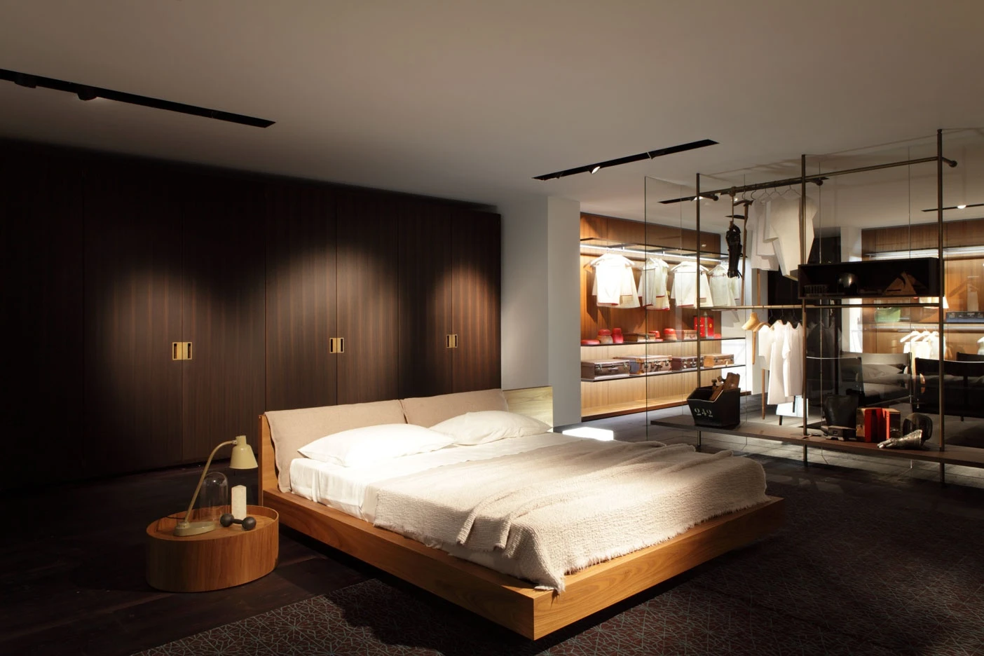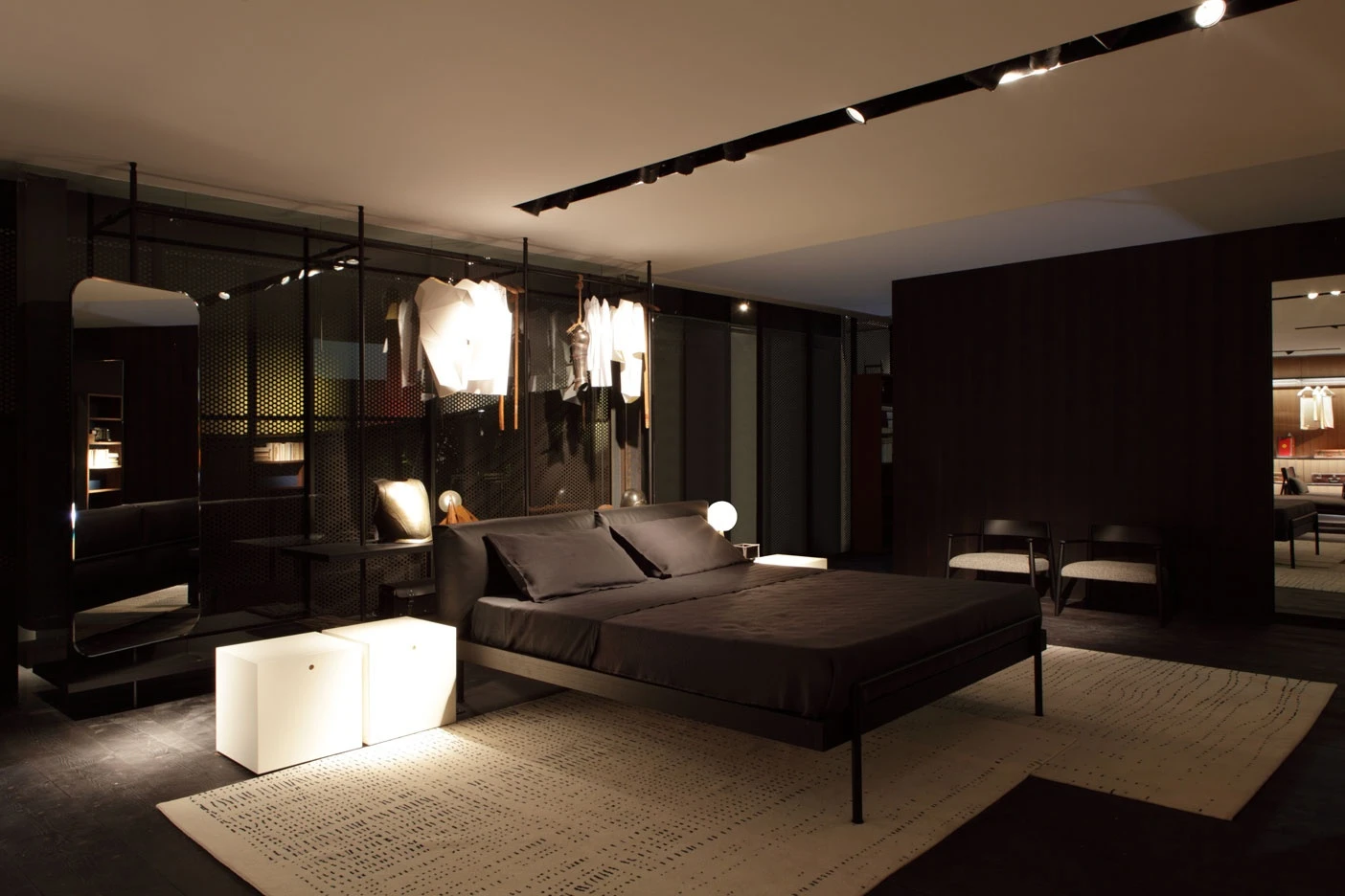 A wide exercise of optical graphical for the first bedroom with the Shin bed matched with 4 Offshore bedside tables and the new dressing Mast. On the left to the bed, the low Ghiaccio armchairs with a mélange black and white fabric, looking in the Reflection mirrors while on the facing wall a System suspended composition is shown.