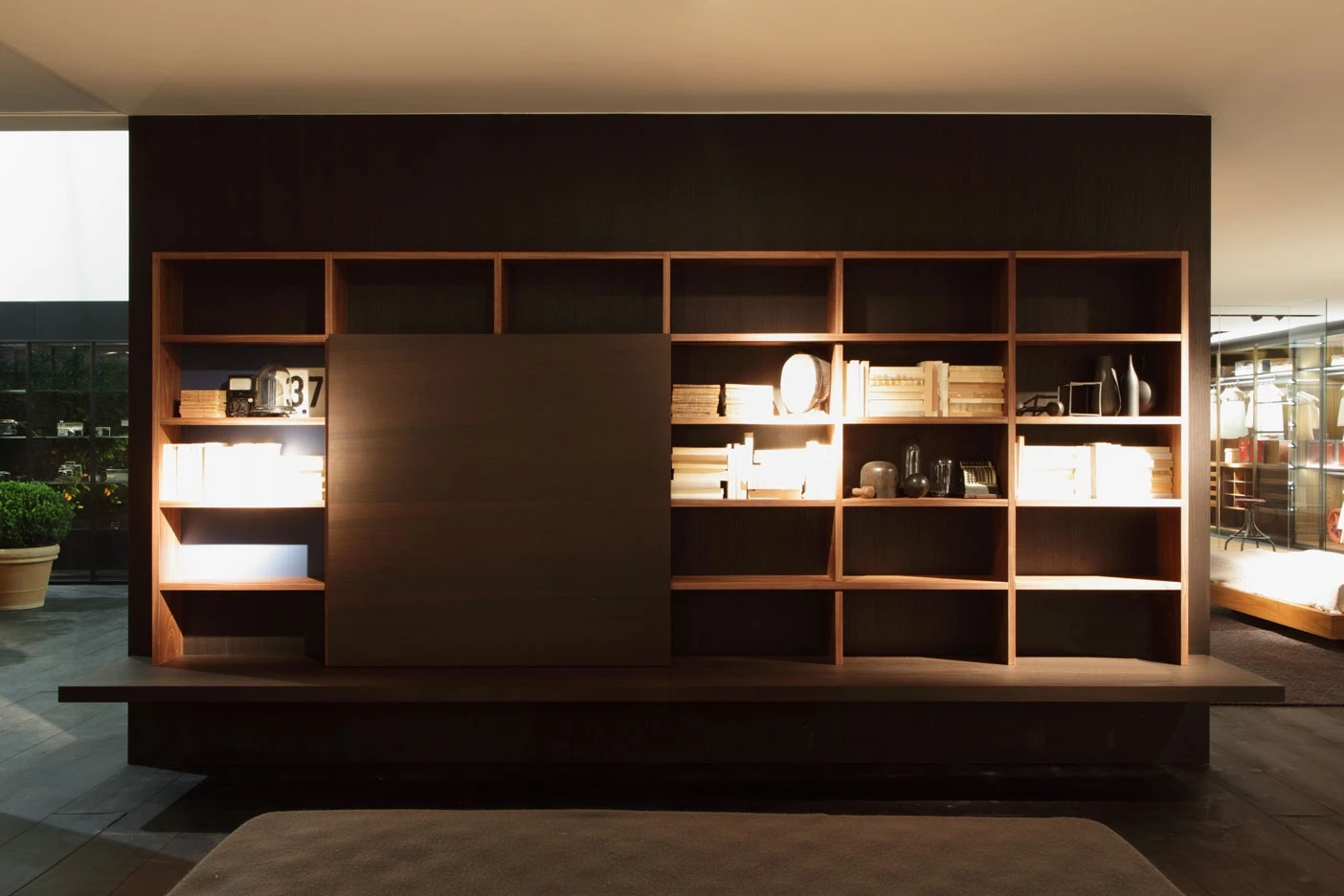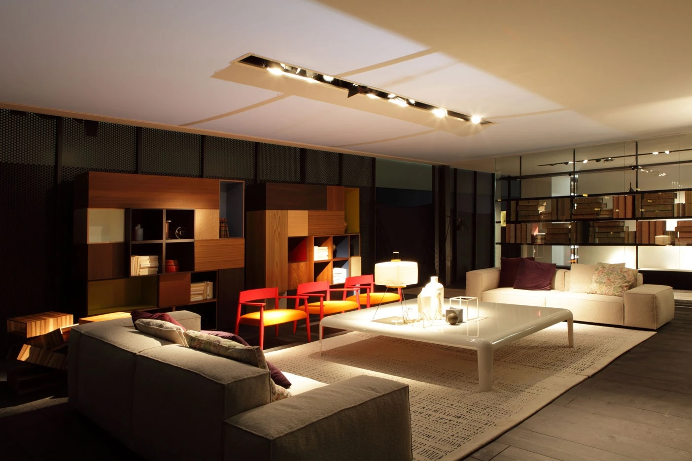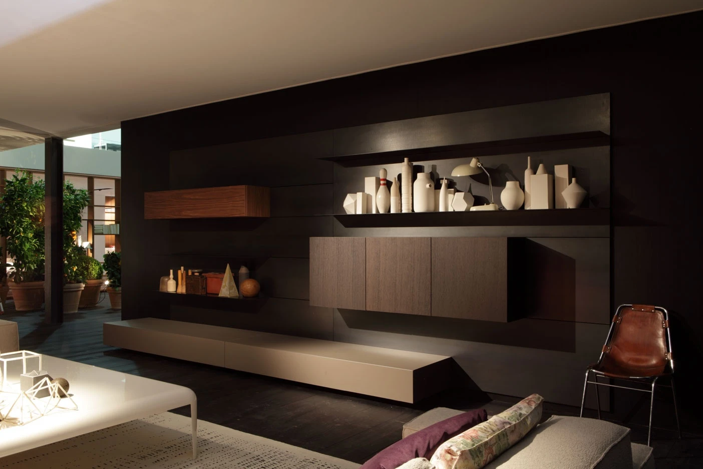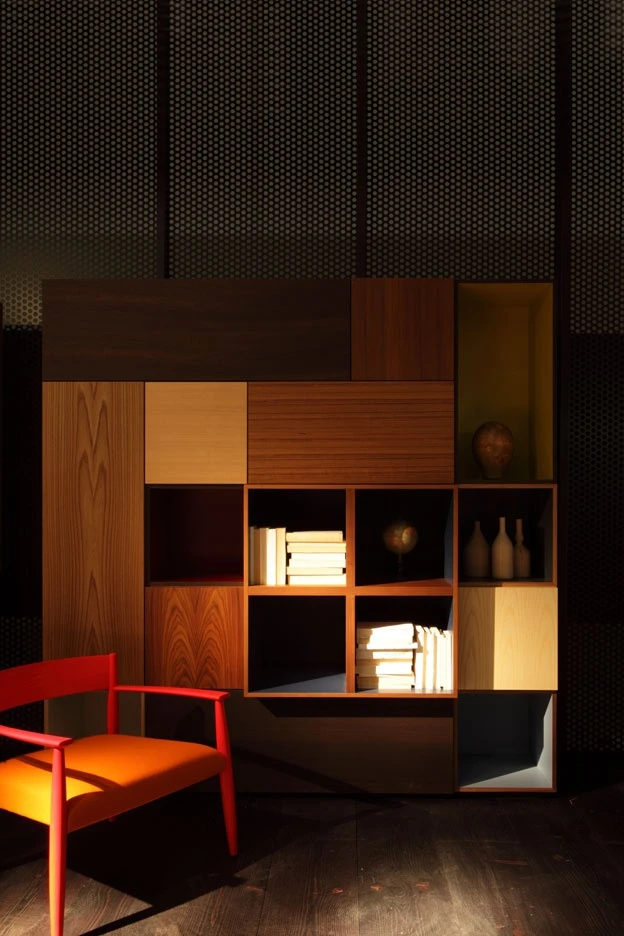 And finally the inviting living area around the glossy white table Ferro h.40 cm is customised with the geometric pattern of the Modern + Load-It wall composition, some colorful Ghiaccio armchairs in red stained ash and orange upholstery, two square floor Modern sideboards: a visual proposal to exhibit any system possible composition and the wide unique finish range, tailored-made according to the customer requirements, thus offering countless top quality proposals.